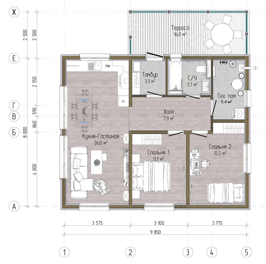 Позвольте представить **Астерию К85‑1** — компактный, но невероятно уютный одноэтажный дом, который в гармонии сочетает традиционный классический стиль с современным комфортом. Его каркас из качественной древесины, обрамленный двускатной крышей, обнадеживает теплом и надежностью, а круглогодичная теплоизоляция превращает этот дом в идеальное решение для семейного отдыха и постоянного проживания в любой погоде. Внутреннее пространство раскрывается через широкую террасу, соединённую с уютным гостиной, где большие окна пропускают естественный свет, создавая ощущение простора и открытости. Атмосфера внутри подчёркнута чистыми линиями интерьера, деревянными фасадами и классическими чертежами кухни, совмещённые с плавными переходами на открытые зоны. Пристроенное чердачное помещение добавляет гибкости – его можно превратить в рабочий кабинет, детскую комнату или просто склад для сезонных вещей. **Астерия К85‑1** — это воплощение простоты и функциональности, подходящее как для молодой семьи, так и для тех, кто ценит уют и спокойствие. Нет необходимости искать отдельный гараж: вместо этого вы можете насладиться просторной террасой и открытыми полями для тихих вечеров, создавая свой уголок счастья и уюта. Выберите надежность, выберите Астерию – ваш новый дом будет радовать вас каждый день.