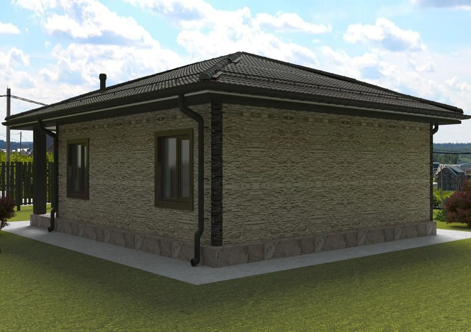 Новый дом в классическом стиле, открывающий пространство и свет даже в самые прохладные зимние дни. Одноэтажная планировка с высокими потолками и обширными панорамными окнами гарантирует полноценное круглогодичное проживание: тёплый, уютный и защищённый от ветра. Внешние стены – из газобетонных блоков – обеспечивают отличную тепло- и звукоизоляцию, а четырёхскатная (вальмовая) крыша добавляет архитектурной выразительности и надежности. Особое внимание уделено удобствам и практичности: просторный внутренний двор, где обитатели могут проводить вечера под открытым небом, и удобная веранда, идеальная для завтрака с видом на сад. Хотя балконов и террас нет, яркая веранда создаёт ощущение простора. В доме предусмотрено чердачное помещение, которое можно приспособить для хранения вещей или превратить в уютную комнату отдыха. Это место, где каждый уголок продуман до мелочей, а атмосфера остаётся домашней, даже когда вы едва выходите из дома.