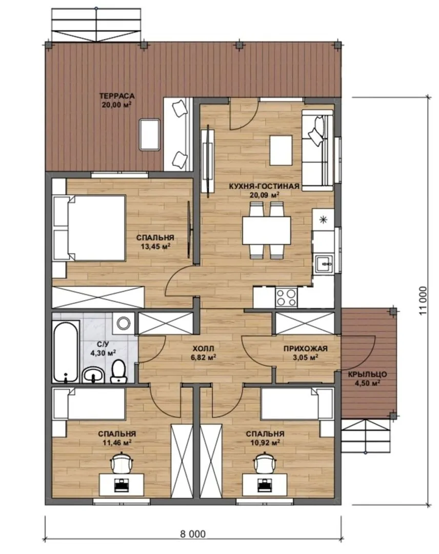 Брусовой дом ТА‑70 — это олицетворение классической уютности в современной жизни. При открытии двери вы сразу ощущаете тепло натурального дерева, которое пронизывает стены и создаёт атмосферу домашнего уюта. Несмотря на своё одиночное поколение, дом рассчитан на круглогодичное проживание: крепкая двускатная крыша удерживает холодную ветровку, а утеплённые берёзы защищают от перепадов температуры. Просторные комнаты, высокие потолки и естественный свет делают пространство светлым и воздушным, а традиционный «классический» стиль придаёт ему изысканную элегантность, которая легко вписывается в любой городской ландшафт. Особое внимание заслуживает уютная терраса, которая превращает ваш дом во второй «гостиный зал» у открытых небес. Здесь можно наслаждаться тихим завтраком с видом на соседние дома, устраивать семейную встречу под открытым небом или просто наблюдать закат в компании любимых. Сочетание натурального брусчатого материала внешних стен и современного инженерного решения гарантирует надёжность и долговечность. Если вы ищете место, где бы сочетается классика, комфорт и простота обслуживания, то брусовой дом ТА‑70 станет вашим идеальным выбором.