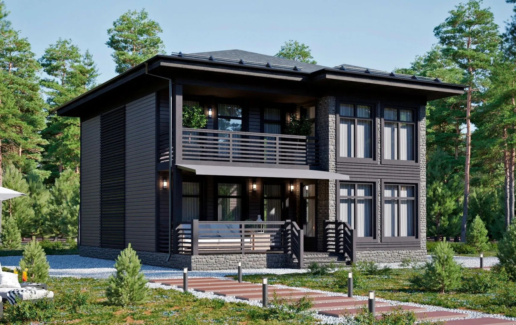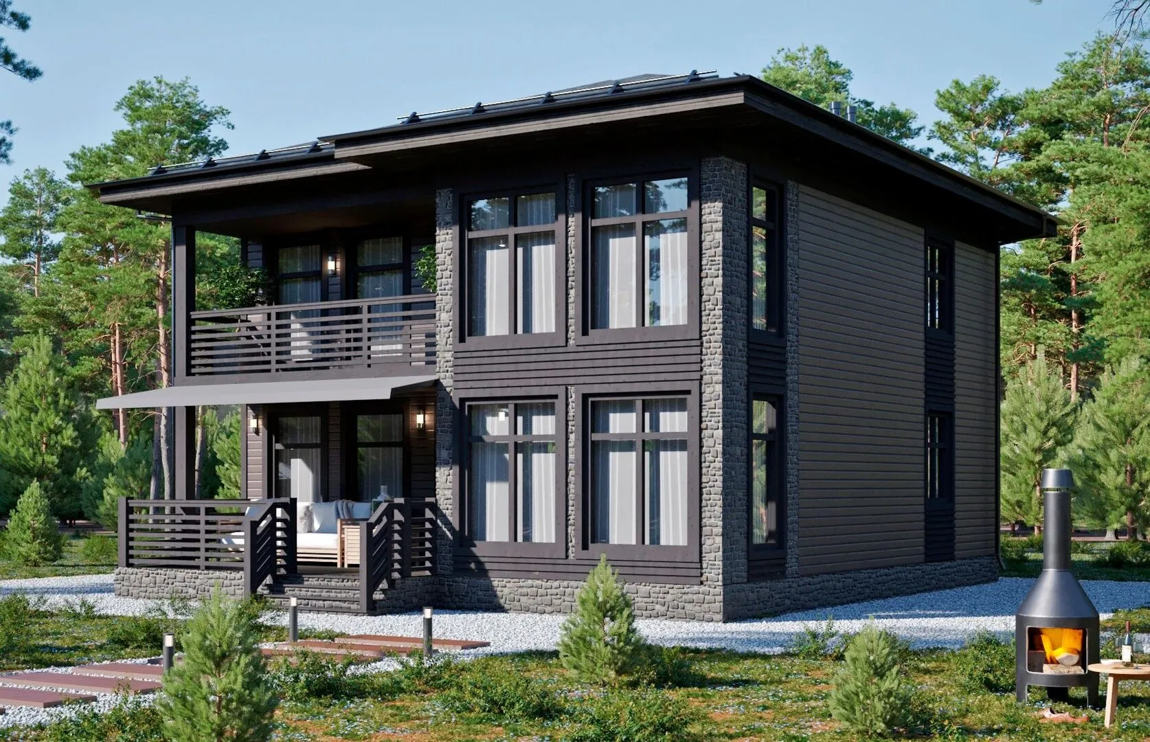 Добро пожаловать в уютный уголок, где каждая деталь создана с любовью к традициям и комфортной жизни. Здание D131‑2 сочетает в себе элегантность классического стиля и современные удобства: два надземных этажа, идеально подходящие для круглогодичного проживания. Каркасные деревянные стены, обрамленные стильными панелями, дарят тепло и естественное ощущение принадлежности к природе, а четыре‑скатная (вальмовая) крыша завершает внешний вид элегантным и практичным. Проживание в этом доме — это не только комфорт, но и вдохновение. В просторном открытом пространстве первого этажа вы найдете удобный холл, который приводит к светлой гостиной, открытой кухне и тёплой спальне‑главной. От первого этажа ведёт просторный балкон, где можно наслаждаться утренним кофе, а в первый вечер с видом на закат можно устроить романтический ужин. Высокие потолки и большое количество окон создают ощущение простора и делают световым поток, который льётся на все уровни дома. Детали делают этот дом поистине особенным: свободный выход на большую террасу, где можно наслаждаться летними вечерами, а отсутствие чердачного помещения и пристроенного гаража позволяют использовать пространство более эффективно и эстетично. Это место, где каждая комната служит вам, а архитектура напоминает о благородных традициях, дополняя современную жизнь. Откройте для себя D131‑2 и почувствуйте, как уют и стиль становятся частью вашей домашней истории.