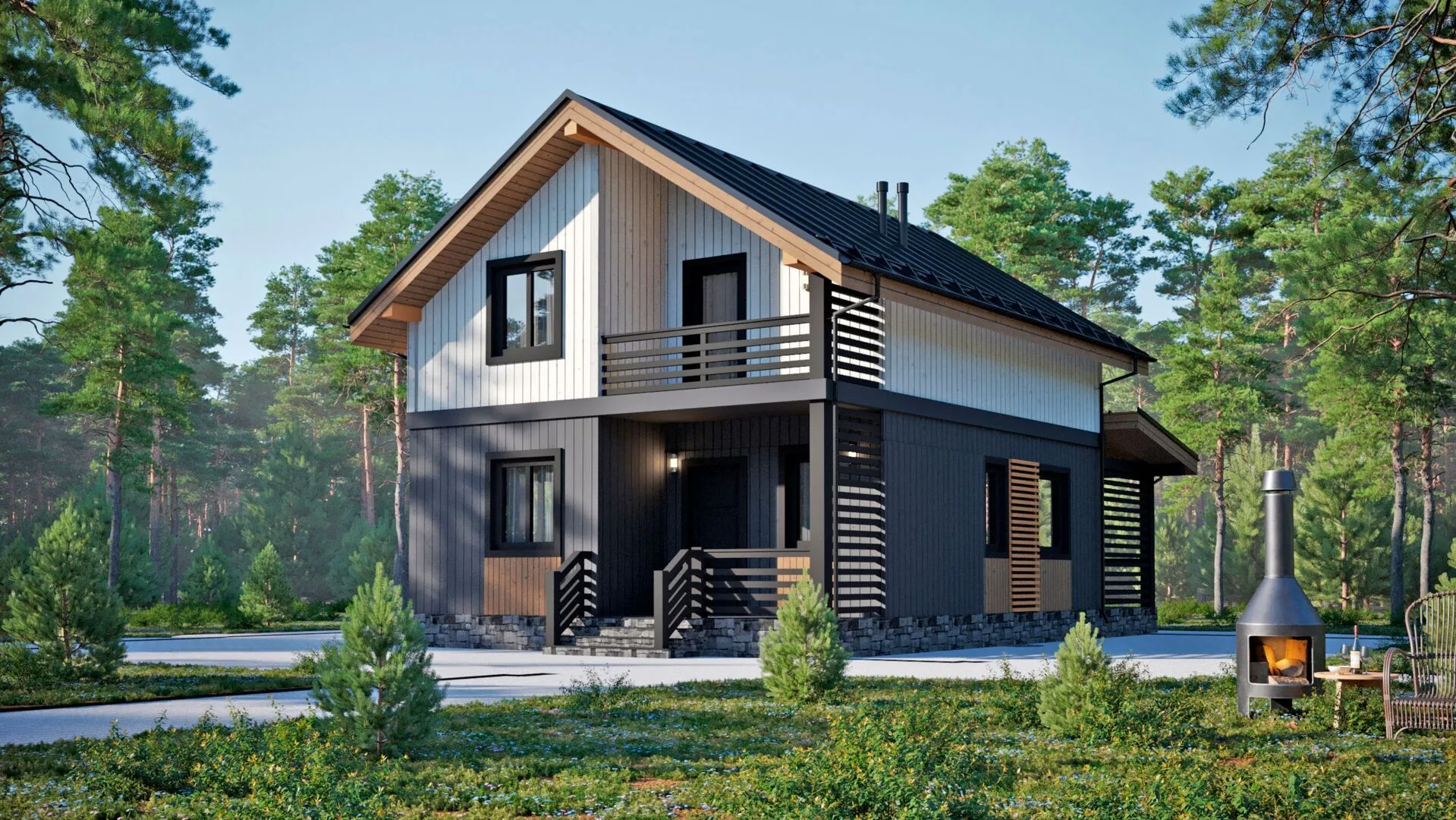 Этот очаровательный двухэтажный дом D141‑2 – настоящий уголок уюта, где классический дизайн встречается с современными удобствами. Его деревянный каркас, выполненный с тонким мастерством, создаёт тепло и мягкую ауру, а двускатная крыша подчёркивает традиционный облик, привнося легкость и элегантность в каждой детали. Благодаря изысканному облику и продуманной планировке, дом обеспечивает круглогодичное комфортное проживание: изоляционные свойства древесины и тщательно выбранный стеклянный пакет позволяют сохранять уют в любую погоду, а светлые, просторные комнаты создают ощущение открытости и свободы. Внутри дом распарахован на два надземных этажа, каждый из которых излучает гармонию и баланс. На первом этаже уютная гостиная приветствует гостей, а из неё открывается просторный балкон/лоджия, идеально подходящий для завтрака на свежем воздухе или вечернего отдыха. На верхнем уровне вас ожидают спальни, где тишина и приватность позволят вам полностью погрузиться в сон после долгого дня. Лаундж-зона, оборудованная яркими окнами, позволяет наслаждаться природным освещением в любое время суток. Погода не мешает вам насладиться моментами на открытом воздухе: веранда с её широким перилами и террасой с каменными настилами создают идеальное место для летних барбекю, вечерних посиделок с семьёй или спокойного чтения в прохладной прохладной тени. Хотя в доме нет пристроенного гаража, рядом доступен крытый подъезд и уличное пространство для безопасной парковки автомобиля. Это сочетание традиций и функциональности делает D141‑2 исключительным выбором для тех, кто ценит качество, стиль и непревзойденный комфорт в каждой детали."