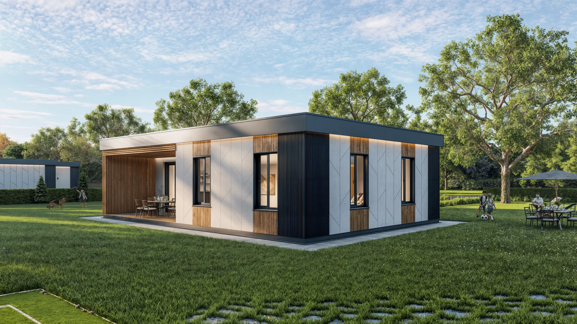 Добро пожаловать в современный дом, где высокие технологии встречаются с комфортом круглый год. Площадь в **155 м²** дарит простор и свободу, а единственный этаж позволяет наслаждаться открытым планом без лишних сходок. Стиль хай‑тек подчёркнут лаконичными линиями, минималистичной отделкой и большими световыми проёмами, которые наполняют интерьер естественным светом. Крепкие наружные стены из полистиробетона обеспечивают изоляцию и стабильность, а плоская крыша добавляет здания гладкости и современности. Уют начинается уже на пороге: просторная веранда приглашает к долгим вечерам и уютным посиделкам на свежем воздухе, а отсутствие балконов делает дом ещё более приватным и безопасным. Плоская крыша открывает перспективу создания своего небольшого сада «под крышей», если вы любите зеленые уголки и свежий воздух. Непрерывное круглогодичное проживание – гарантировано благодаря качественной тепло- и звукоизоляции. Этот дом – идеальное сочетание современной эстетики, практичности и комфорта, созданное для тех, кто ценит простоту и стиль в каждой детали.