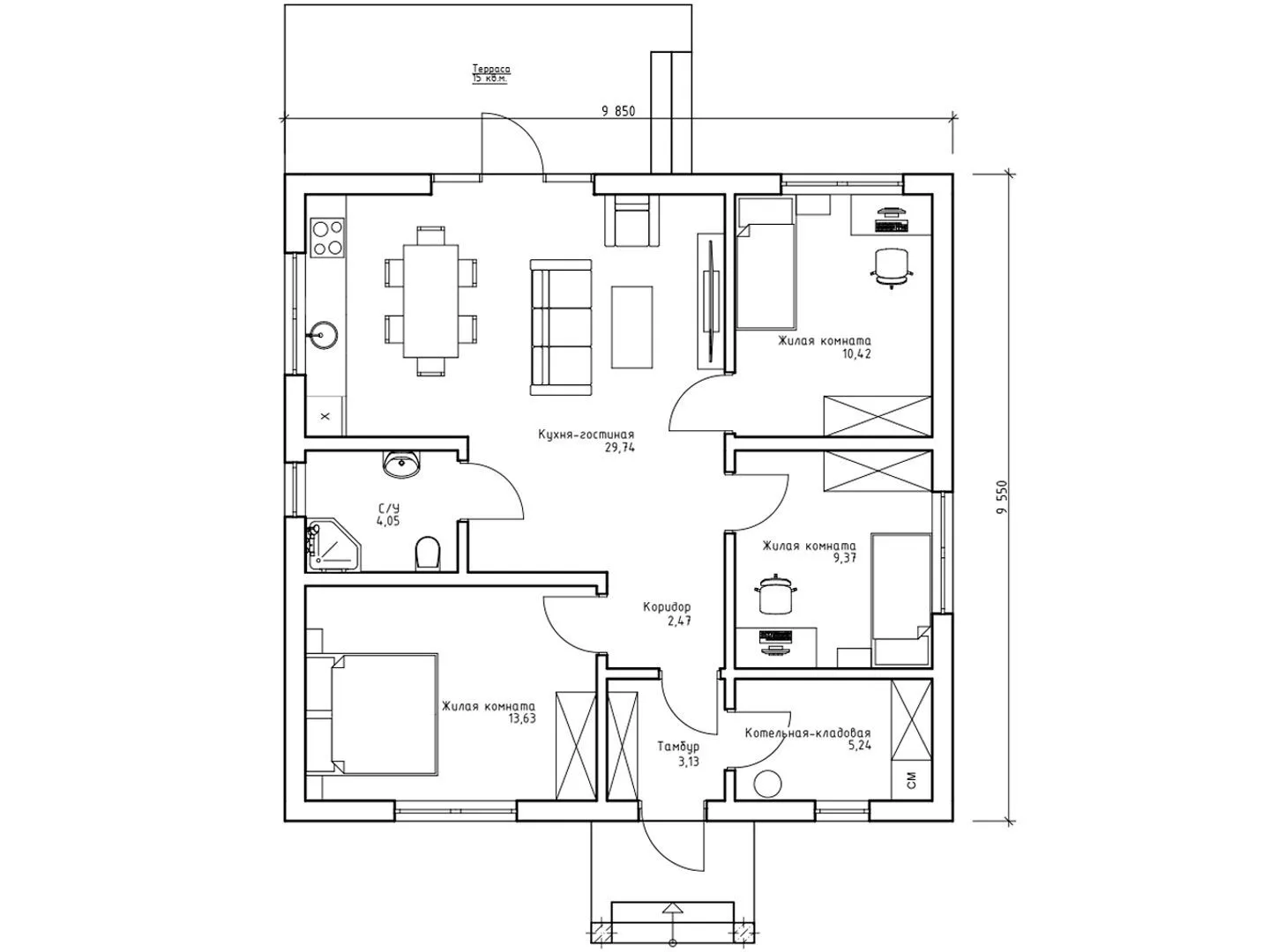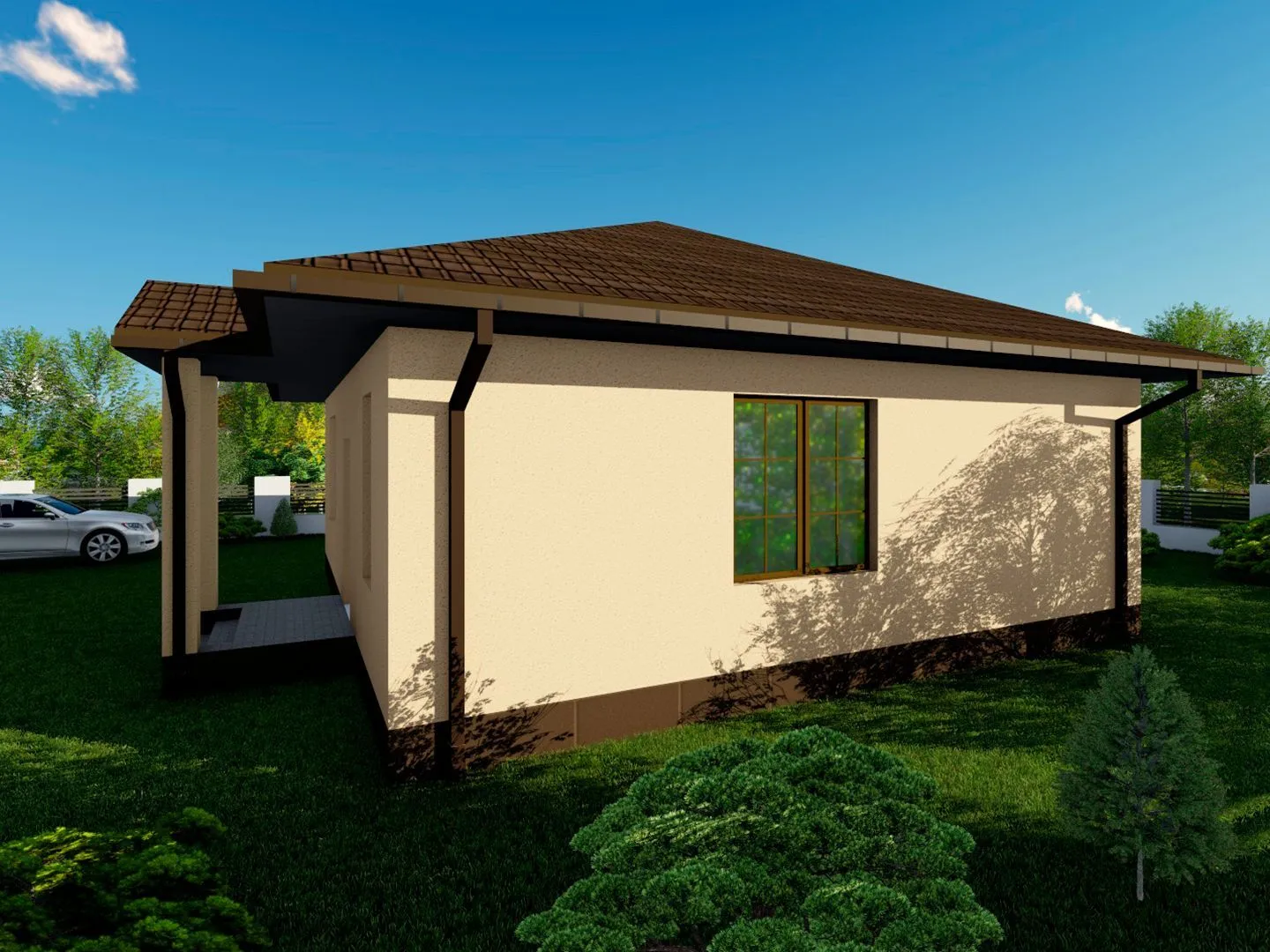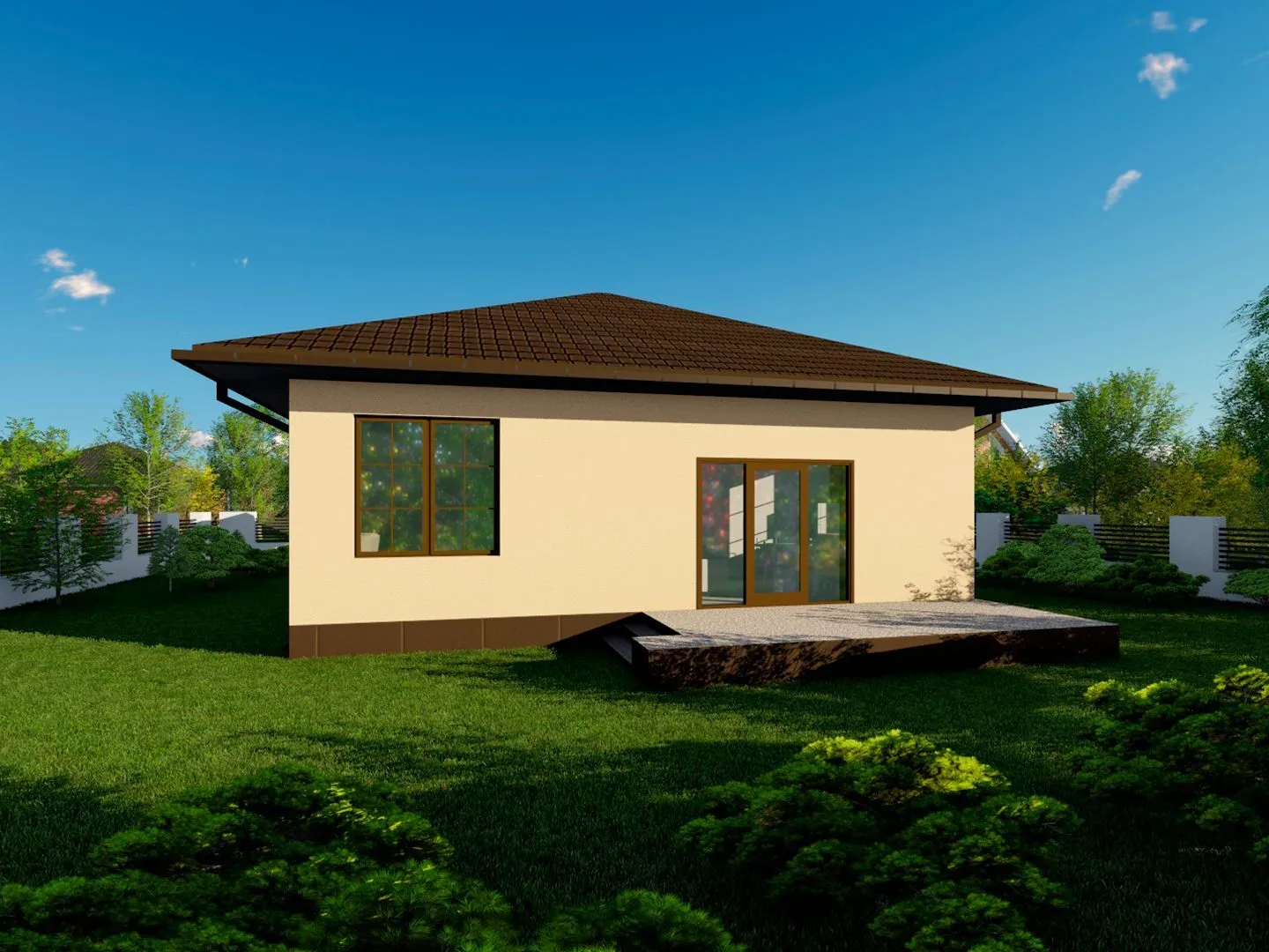 Небольшой, но уютный объект с единственным надземным этажом – это настоящий уголок гармонии и комфорта. Его европейский стиль восхищает строгими линиями и аккуратными деталями, а в каждом уголке чувствуется забота о деталях: аккуратная отделка, продуманная планировка и тёплое световое решение делают квартиру настоящим домом. Благодаря круглогодичному обустроению гости могут наслаждаться здесь комфортом, независимо от погоды – в любое время года здесь будет тепло и светло. Особое внимание на этом объекте уделено материалам. Внешние стены выполнены из газобетонных блоков, что придаёт конструкции легкость и изоляцию, одновременно создавая современный, но не оторванный от природы внешний облик. Крыша в классическом четырёхскатном (вальмовом) стиле завершает образ, напоминая о времени и традициях европейского строения. Террасный уголок, открывающий вид на зелёную палитру и создающий дополнительное пространство для отдыха, является роскошью, которую ценят каждый хозяин. Здесь можно расположить небольшую уютную зону для завтраков, устроить мини-спасительную атмосферу под открытым небом, ведь в доме отсутствуют балконы и веранда, а всё пространство оптимизировано под ваши нужды. Гараж и полуторный скрещённый этаж отсутствуют – это позволяет избежать лишних излишеств и сосредоточиться на настоящей ценности: простоте, уюте и приятных делах, которые можно делать именно дома.