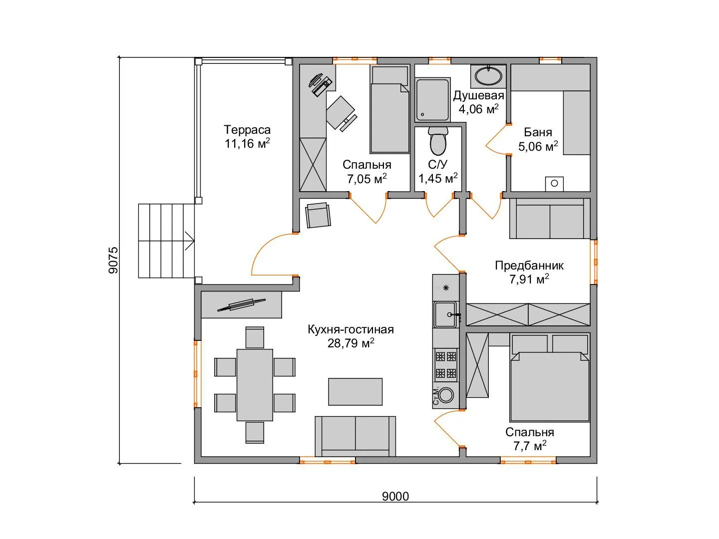 **Дом Каролина** — это истинное сочетание простоты и благородства, где каждый элемент говорит о внимании к деталям. Первые лучи утра падают в открытые деревянные стены, созданные из прочных каркасных материалов, и мгновенно наполняют пространство согревающим, почти домашним светом. Классический, но без лишних украшений фасад подчеркивает чистую линию и элегантность, в то время как двускатная крыша придает дому благородный, почти монументальный вид. Один уровень жизни, полностью выстроенный для круглогодичного комфорта, позволяет семье ощущать уют в любой климатической ситуации. Внутреннее пространство поражает своим простором и вниманием к функциональности. В отсутствие балконов и веранд открытость интерьера достигается через большие окна, которые открывают панораму наружу и придают ощущение бесконечности. Чердачное помещение превращается в гибкую зону — будь то уютный домашний кинотеатр, тихий уголок для чтения или дополнительная спальня. Вместе со стеновой гардеробной и просторными кухонными зонами, картина простого жизненного ритма и современного удобства складывается в несложную, но глубокую гармонию. Насладитесь прогулкой по просторной террасы, где можно провести выходные за чашкой кофе или устроить семейный барбекю, а тихо шуршащая осада дерева, окаймляющего дом, напоминает о том, что здесь всегда найдется место для уюта и природной красоты. Дом Каролина — не просто здание, это убежище, где каждая деталь призвана дарить спокойствие и радость от простых, но качественных моментов жизни.