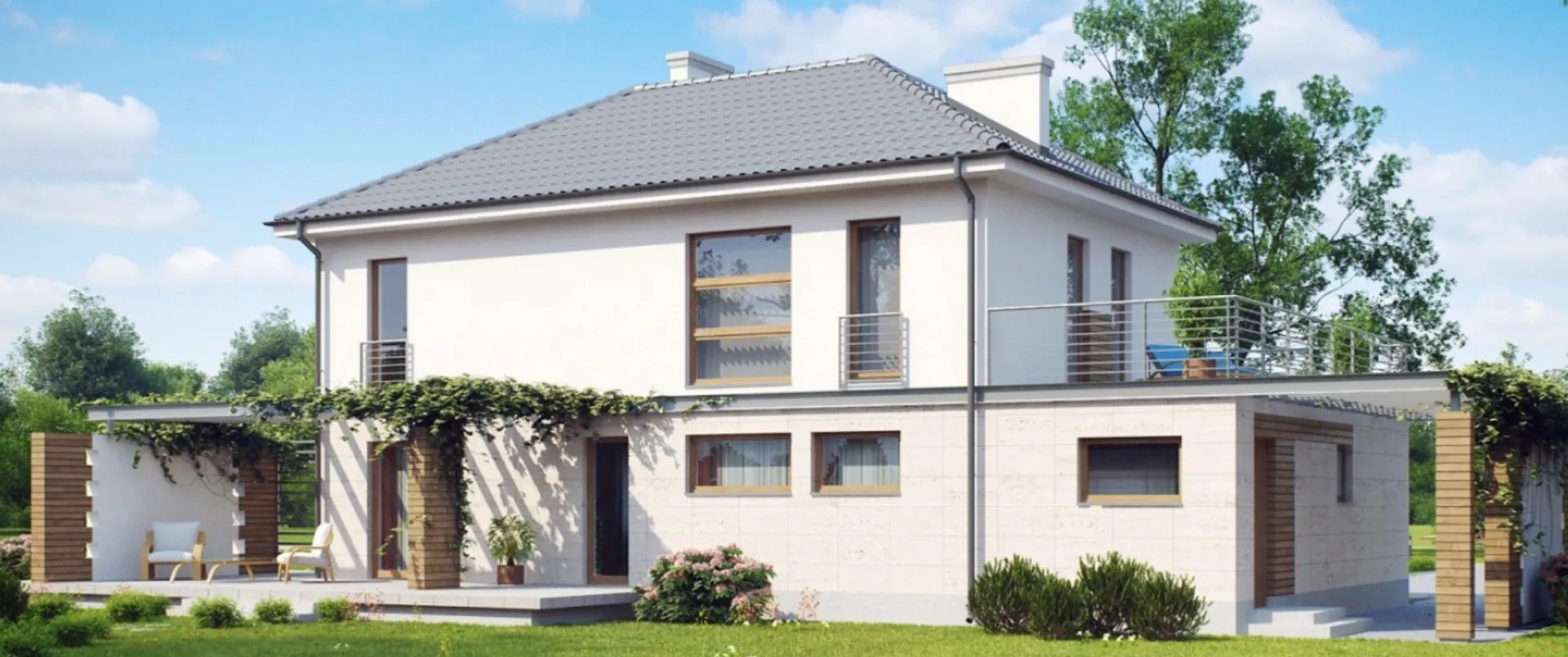 Шикарный современный европейский дом с двумя надземными этажами станет идеальным уютным уголком вашей семьи. Стена дома выполнена из теплоизоляционных газобетонных блоков, что обеспечивает комфортную температуру круглый год и экономию на энергопотреблении. Удобная лестница ведёт к просторной террасе над присоединённым гаражом, где можно устраивать вечерние посиделки и смотреть закат – настоящий мини‑парк у вашего дома. Экстерьер сочетает в себе стильную простоту и функциональность: четыре скатные крыши придают дому архитектурный баланс, а уникальный винтажный «вальмовой» крытый «постель» защищает от непогоды, одновременно создавая романтическую атмосферу в любое время года. Один балкон/лоджия открывает захватывающий вид на окрестности, а открытая автостоянка позволяет вам быстро и безопасно парковать автомобиль, не прибегая к поиску сторонней услуги. Это место, где каждый элемент продуман до мелочей, чтобы вы могли наслаждаться безмятежностью и гармонией в своем новом доме.