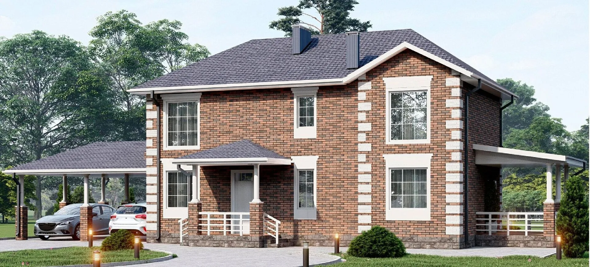 Уютный, двухэтажный дом № 8 – это воплощение классической эстетики, выполненное при помощи современных технологий. Газобетонные блоки придают стенам прочность и теплоизоляцию, а характерный четырёхскатный вальмовой чердак придает облику неповторимый «домашний» шарм. Дом предназначен для круглогодичного проживания, поэтому каждый уголок радует уютом и комфортом независимо от погоды. В просторных комнатах с высокими потолками ощущается лёгкость и свет, а большая веранда создаёт ощущение продолжения интерьера на открытом воздухе, где можно отдохнуть после насыщенного дня. Пристроенный гараж с крытой автостоянкой обеспечивает уединённое место для машины и хранение техники. Всё это делает дом идеальным для семей, ценящих традиционный стиль, но при этом требующих современной комфортности и функциональности.