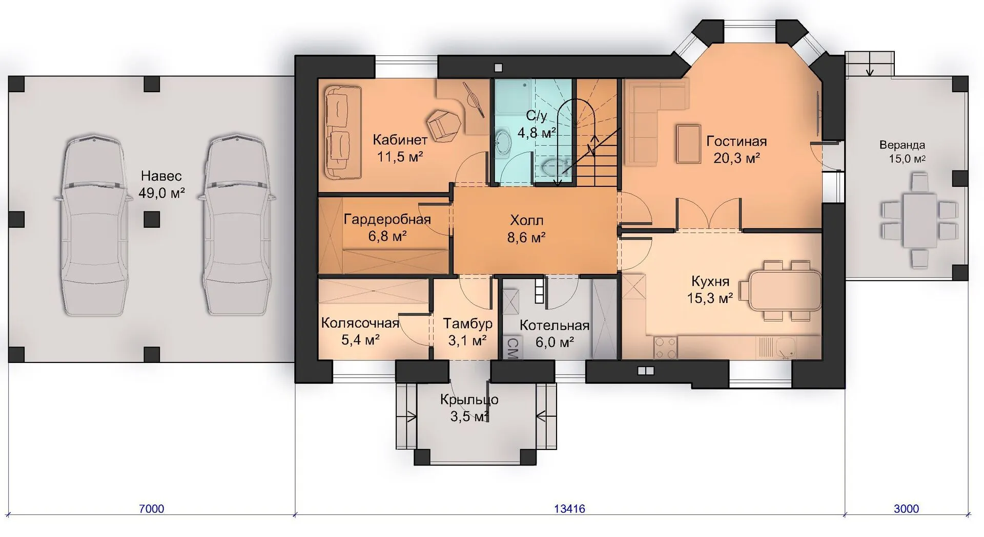Классический эт дом 115м2 с 4 спальнями