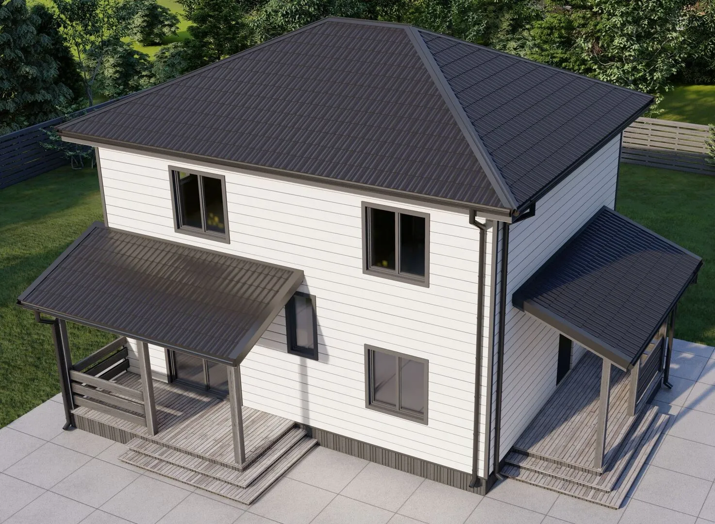 Затерянный в живописном уголке вашего будущего двоэтажного дома SH100, каждая деталь создаёт ощущение уюта и гармонии. Классический стиль сдержанно отражён в элегантных фасадах, отрисованных из высококачественных SIP‑панелей, которые дарят износостойкость и теплоизоляцию, превращая дом в надёжное убежище на всё время года. Четырёхскатная (вальмовая) крыша дополнительно добавляет величия и защищает от суровых погодных условий, сохраняя вашу семейную жизнь спокойной и беззаботной. Внутри просторные, светлые комнаты располагаются по двум этажам, создавая идеальное сочетание приватности и общения. Аромат свежего полива в летний день и тёплый летний свет за окнами делают каждый момент в доме особенным. На заднем дворе, с открытой террасой, вы ощутите свободу: это идеальное место для ужинов на открытом воздухе, семейных посиделок или просто отдыха после долгого дня. Без лишних наворотов: в доме нет веранд, балконов и чердачных помещений, а всё, что нужно, — это уютное пространство, где каждый камень говорит о доме, готовом принять вашу семью в долгожданный комфорт.