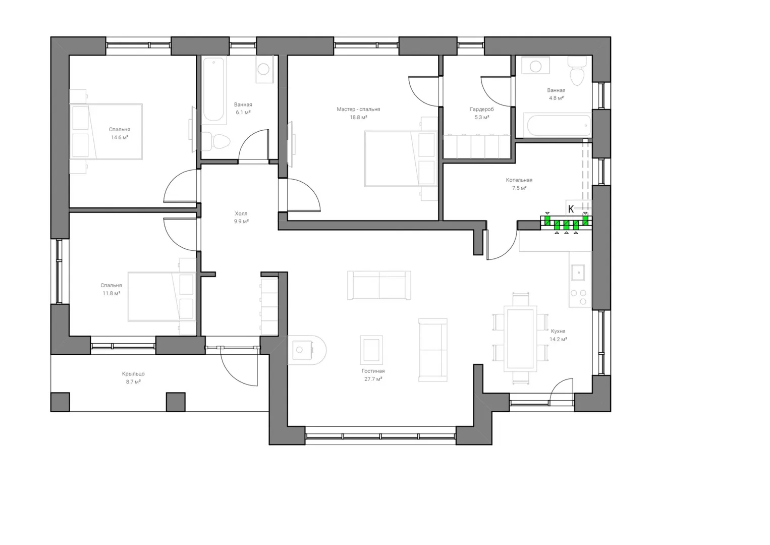 Погрузитесь в атмосферу уюта и гармонии – «Грата 1‑120» словно создана для того, чтобы стать вашим личным уголком, где каждая деталь говорит о тщательном подходе к архитектуре и комфорту. Её классический фасад, выполненный из керамических блоков, излучает солидность и эстетичность, а строгая двускатная крыша подчеркивает строгую линию внешнего вида, придавая дому внушительный, но при этом приглашающий характер. Дом рассчитан на круглогодичную жизнь: тепло в зимнем воздухе и прохлада ветра в летний день – всё сочетается благодаря продуманной тепло- и шумоизоляции. Отсутствие внешних балконов и веранд не мешает вам наслаждаться свежим воздухом – просторная терраса с открытым небом дарит ощущение лёгкости и свободы, где можно собраться с семьёй и друзьями, устроить барбекю или просто пить чашку чая, наблюдая за закатом. Структура «Грата 1‑120» – это один надземный этаж, на котором располагаются все необходимые уютные и функциональные зоны. Внутри вас ждёт светлый, воздушный интерьер, где каждая комната пропитана классическим уютом. Просторный гостевой зал с открытой планировкой, удобная кухня и уютные спальни – все это создаёт идеальную атмосферу для вашего домашнего комфорта. Безстроенные гаражи и чердачные помещения не нужны: вы получаете полный набор преимуществ одного уровня, где каждая деталь продумана с любовью и заботой о ваших потребностях.