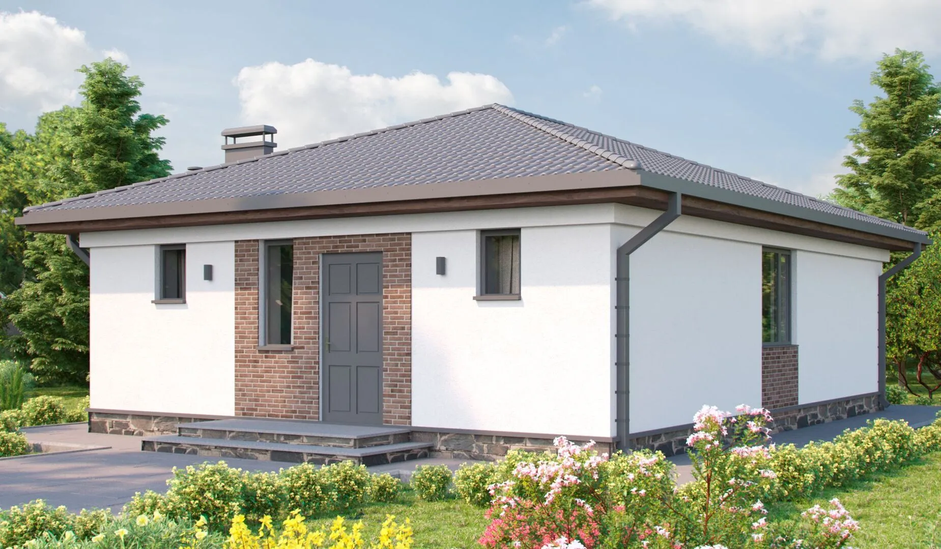 Немного романтики классического стиля и гармония природных материалов воплотились в одном уютном доме с открытым, непринуждённым обликом. Он построен на ровной площадке, его изящная фасадная отделка из газобетонных блоков придаёт ощущение легкости и свежести, а четыре скат крыши, выполненные в традиционном вальмовом стиле, обеспечивают надёжную защиту от непогоды и создают атмосферу спокойствия. Одноуровневая планировка позволяет легко передвигаться по дому, не переживая о лестницах, а просторные окна дарят живописный вид на зелёную окрестность и пропускают кристальный свет во все коридоры. Это идеальное место для семейного уюта и гостей, которые ценят комфорт круглый год. Ограничение на наличие балконов, веранд и гаражей делает интерьер более светлым и открытым, создавая ощущение простора, а отсутствие чердая позволяет использовать всё пространство дома для привычных потребностей. Внутри каждый квадратный метр наполнен теплом, уютом и функциональностью: просторная гостинная, современная кухня и спальни, где вы можете восстановить силы после дня приключений. Этот дом — ваш собственный уголок, где традиционный комфорт встречается с элегантностью и простотой, а каждая деталь проработана до совершенства.