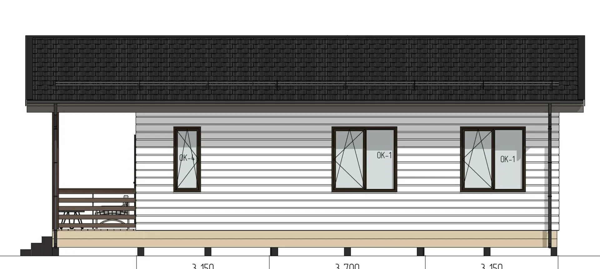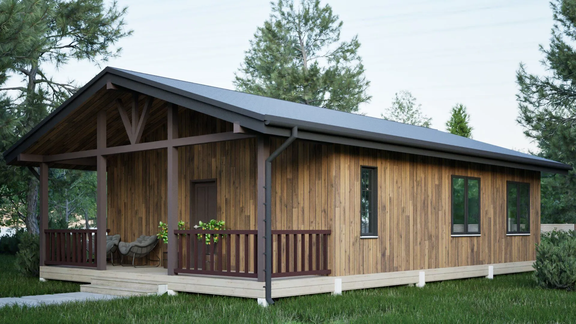 Небольшой, но изысканный одноэтажный каркасный дом **Brown** – ваш личный уголок русской классики, где каждый элемент выверен до совершенства. Стены из крепчайшего деревянного каркаса придают стенкам устойчивость и тепло, а двойная скатная крыша, выполненная в традиционном русском стиле, создаёт ощущение простора и защищённости. Никаких лишних балконов и лоджий, только чистая, открытая линия фасада, подчёркивающая элегантность и гармонию. Дом спроектирован для круглогодичного проживания: мягкие, уютные интерьеры, которые радуют глаз и душу не только зимой, но и летом. Внутри вы почувствуете тёплый, природный свет, благодаря большим окнам, открывающим вид на живописный ландшафт. В нём каждый уголок наполнен заботой о комфорте: оптимальная теплоизоляция, продуманная вентиляция и износостойкие материалы делают этот дом идеальным для семьи, ценящей гармонию и надёжность. Терраса в свободном пространстве становится живой сценой для рассветов, вечеров и уютных посиделок на свежем воздухе. Сочетание классического русского архитектурного стиля с современной конструктивной практичностью делает дом **Brown** привлекательным вариантом для тех, кто хочет жить в гармонии с природой, но при этом не жертвуя удобством и функциональностью. Откройте дверь в будущее – здесь каждый уголок дышит теплом, а каждая деталь создаёт неповторимый домашний комфорт.