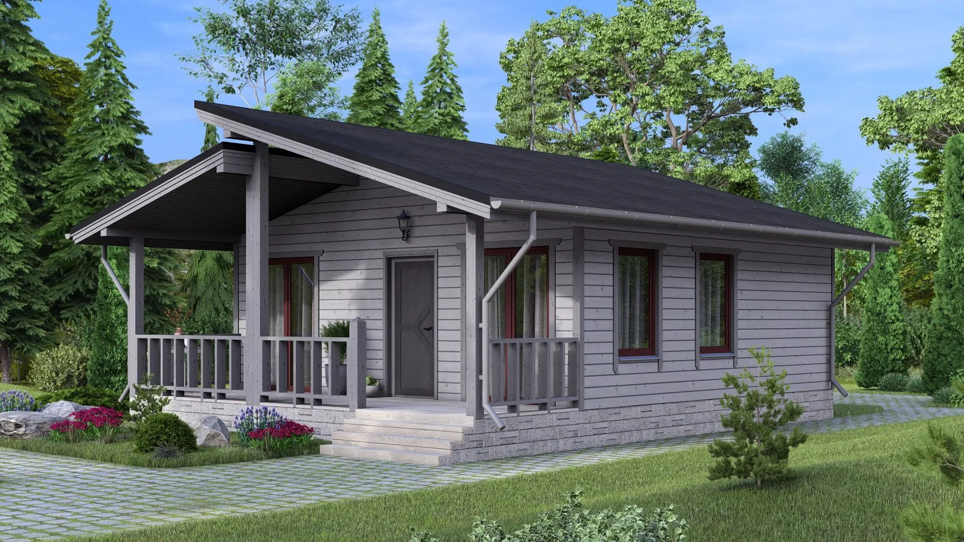 **Дом «Скопин» – это элегантный уголок скандинавского уюта в самом сердце природы.** Построенный на ровной площадке, он сочетает в себе простоту и тонкую элегантность: деревянный каркас, двойная скатная крыша и обширная терраса, где можно наслаждаться рассветами и закатами, погружаясь в звуки леса. Благодаря своему единому надземному этажу дом обеспечивает ровный климат круглый год, а просторные окна создают иллюзию открытого пространства, привлекая солнечный свет в каждый уголок. **Простор внутри и уют снаружи** — здесь нет лишних балконов и прицепленных гаражей, а именно простая, но функциональная планировка, в которой каждая комнаты наполняется светом и тишиной. Это идеальное место для тех, кто ценит спокойствие, простоту и гармонию с природой. Пространство легко адаптируется под любые потребности, позволяя создать свой собственный скандинавский оазис тепла и уюта.