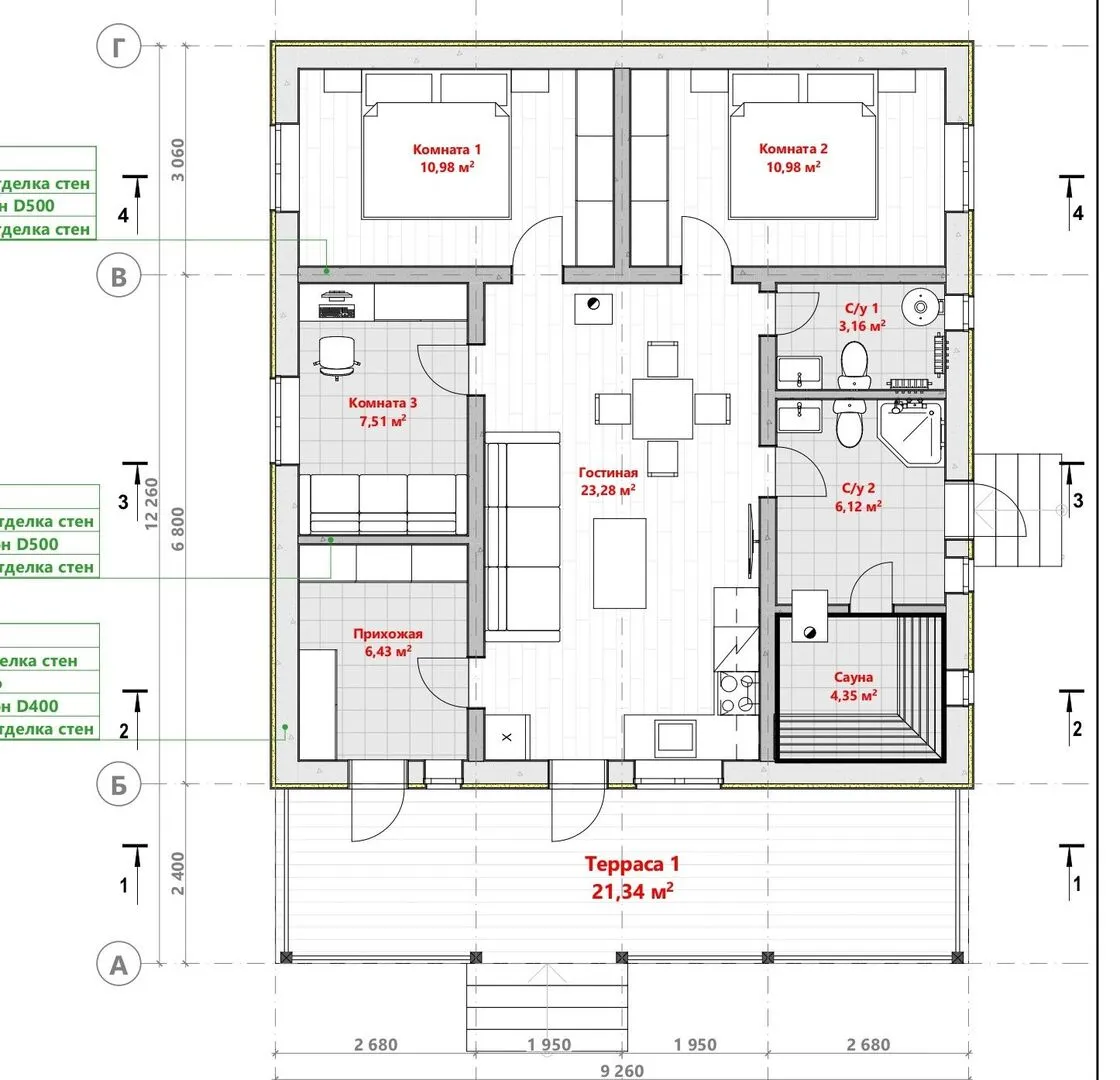 Выход в светлое, открытое пространство — это простота и гармония, которые предлагает новый дом в стиле скандинавского дизайна. Однонадземный «Килпи» из газобетонных блоков восстанавливает идеальный баланс между теплом и воздухопроницаемостью: материал обеспечивает отличную теплоизоляцию, позволяя жить в доме круглый год, даже в самых суровых климатических условиях. Двускатная крыша, выполненная в классическом варианте, добавляет объём и элегантность, а лёгкая конструкция защищает от ветра и пролётов осадков. Внутренние помещения продуманы так, чтобы каждый сантиметр пространства служил комфорту и функциональности. Прозрачные просторы, открытые светом и воздухом, создают ощущение безграничного пространства, а тонкие линии скандинавской стилистики подчёркивают лаконичность современных интерьеров. Бесперебойное соединение с открытой террасой привносит свежесть и зелёную ауру прямо в ваш дом, позволяя наслаждаться природой, оставаясь при этом в безопасности от ветра и дождя. Сделайте шаг к новой жизни в «Килпи» и почувствуйте, как легко может быть уют. Это не просто строение, а полноценная домашняя среда, созданная с учётом ваших самых смелых пожеланий и нужд. Ваша мечта об идеальном доме станет реальностью благодаря сочетанию экологических материалов, скандинавского стиля и продуманной архитектуры.