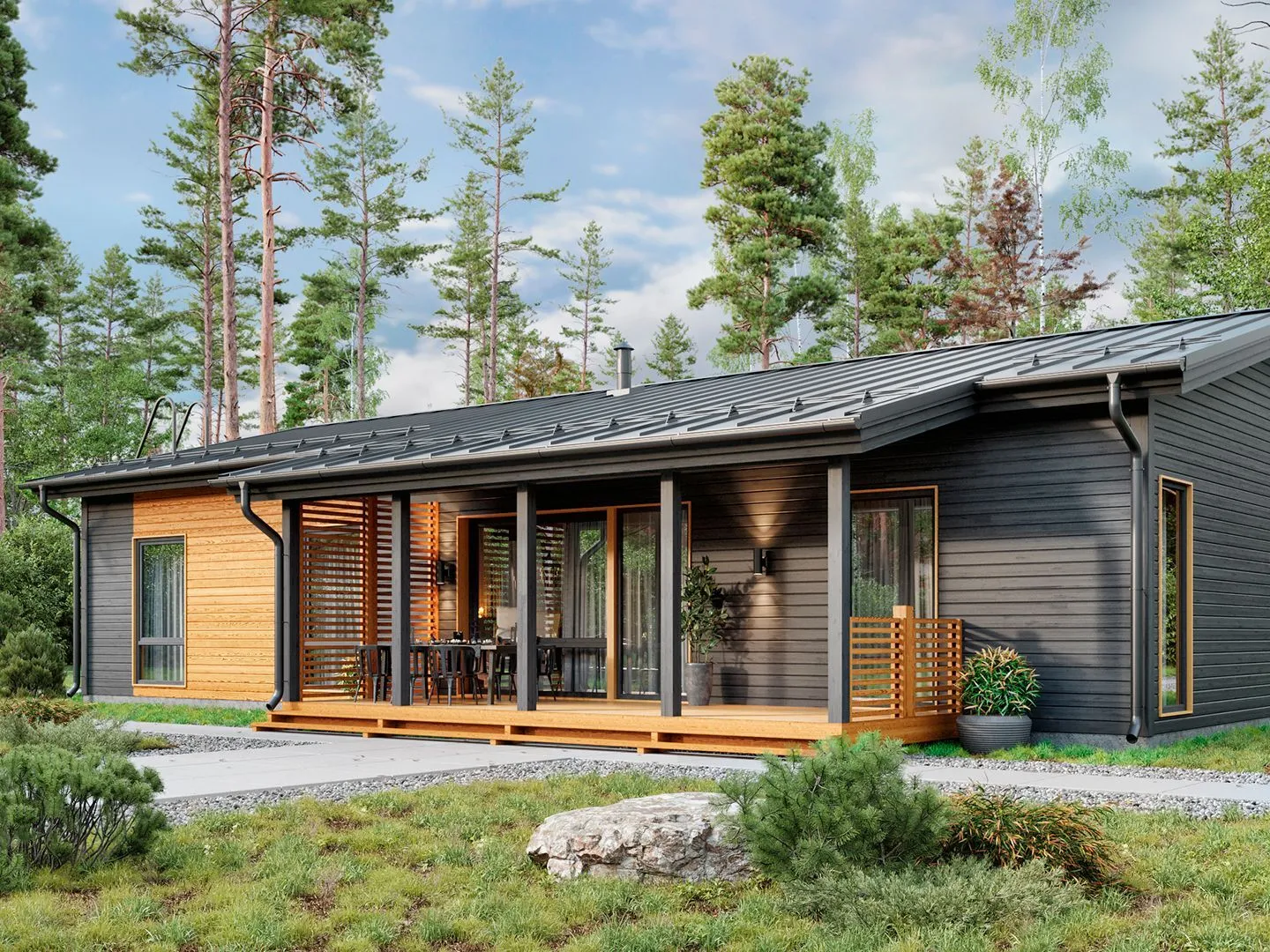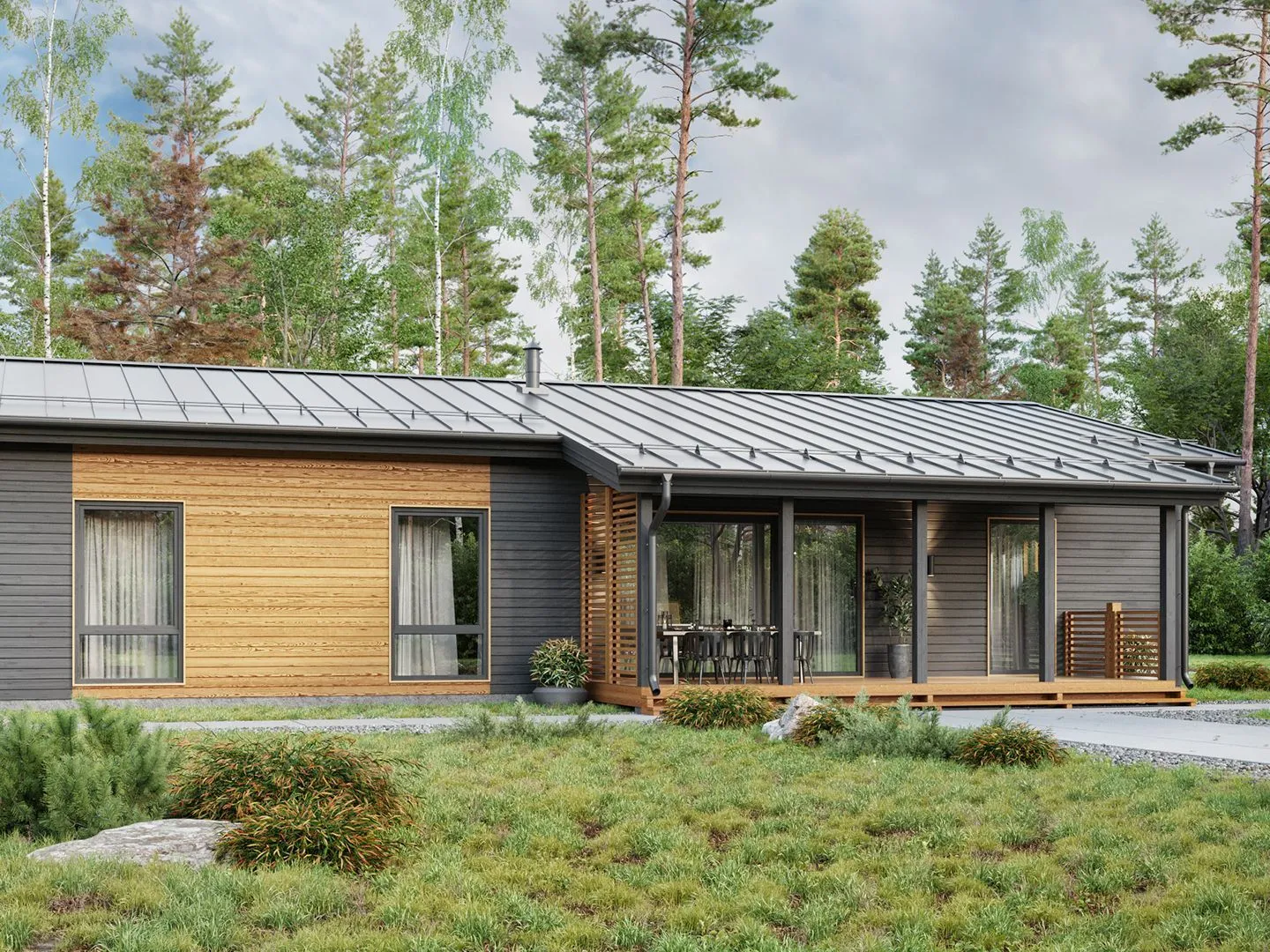**LV150‑И1у** – это идеальное решение для тех, кто ценит сочетание функциональности и скандинавской элегантности. Архитектурный стиль, вдохновлённый простыми формами и природными материалами, создаёт ощущение лёгкости и уюта. Дом однокроверный, но с просторным внутренним планировочным дизайном: просторные, светлые помещения, высокие потолки и большие окна пропускают в комнату ласковый дневной свет, а двойногранная крыша добавляет архитектурного акцента и создаёт ощущение защищённости. Камера 150 м² с каркасно‑панельной конструкцией гарантирует прочность и теплоизоляцию, а наружные стены, выполненные из натурального дерева, дарят домашнему интерьеру атмосферу уюта и натурального тепла. Внутри предусмотрена комфортная зона, где можно проводить вечера в компании семьи и гостей, а открытая терраса обеспечивает отличный уголок для зимних прогулок и летнего отдыха без лишних балконов и веранд. Дом **LV150‑И1у** – это гармония стиля, инженерии и простоты, который делает ваш дом местом, где можно действительно жить круглый год, наслаждаясь тишиной деревенского покоя и комфортом современной жизни.