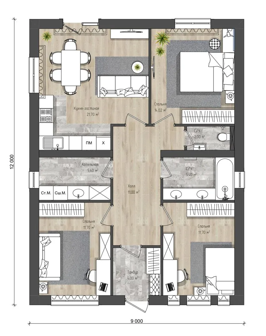 Дом «Майами» — это идеальное сочетание уюта и европейской элегантности на одном уровне. Благодаря однокровневому строению каждая комната открывается на свет и простоту, а отсутствие лестниц делает его особенно привлекательным для семей с детьми и пожилыми людьми. Долгосрочное проживание гарантировано: влага удерживается от внешних стен, выполненных из газобетонных блоков, а прочная четырехскатная (вальмовая) крыша защищает от любых погодных условий, создавая надёжный убежище на любой сезон. Эстетика дома подчёркивается безупречным европейским стилем, где лаконичные линии и тщательно продуманные детали создают гармоничное пространство. Внутреннее убранство сдержано и изыскано, позволяя сосредоточиться на приятном окружении и качестве жизни. Небольшая площадка перед домом, украшенная ухоженным садом, становится природным продолжением интерьера и привносит свежесть и умиротворение в повседневную рутину. Несмотря на лаконичность фасада, «Майами» оснащён всем необходимым для комфортной жизни: просторной кухней, светлыми спальнями и удобным санузлом. В доме нет лишних узлов – от балконов до пристроенного гаража – что делает его простой в обслуживании и экономичной в эксплуатации. Выбирая «Майами», вы получаете не просто жильё, а настоящее уединённое убежище, где каждая деталь продумана до последнего штриха, а каждый день начинается на свежем воздухе и в круглом пространстве европейской гармонии.