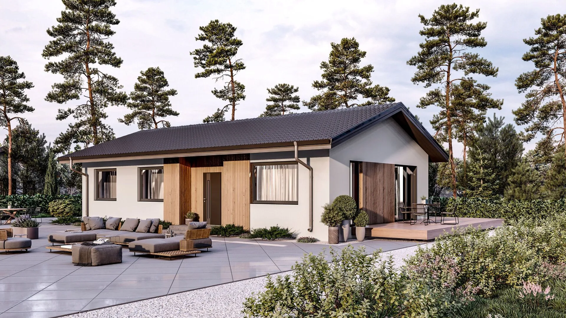 На первом этаже спроектирован уютный дом, обрамленный лёгкостью скандинавского дизайна. Ему присуще открытое и светлое пространство, благодаря большому количеству окон и просторной террасе, где можно наслаждаться свежим воздухом и вкусами местных сезонных продуктов. Каждый уголок был продуман так, чтобы обеспечить комфорт круглый год: от теплоизоляции газобетонных блоков до прочной двускатной крыши, которая с лёгкостью отводит дождь и снег. При открытом плане внутри царит спокойствие и простота, характерные для скандинавского стиля, а внутреннее убранство можно легко адаптировать под собственные вкусы. Для любителей активного отдыха и творческих проектов в доме предусмотрено чердачное помещение – это дополнительное пространство, которое можно превратить в мастерскую, студию йоги, домашний офис или просто уютный уголок для чтения. Отсутствие прикрытой автостоянки позволяет насладиться свободой, а просторные межкомнатные перегородки создают ощущение лёгкой приватности и свободы перемещения. Море простора, чистого воздуха и натуральных материалов – именно то, что делает «Микея 3» идеальным выбором для тех, кто ищет уединение и одновременно современность.