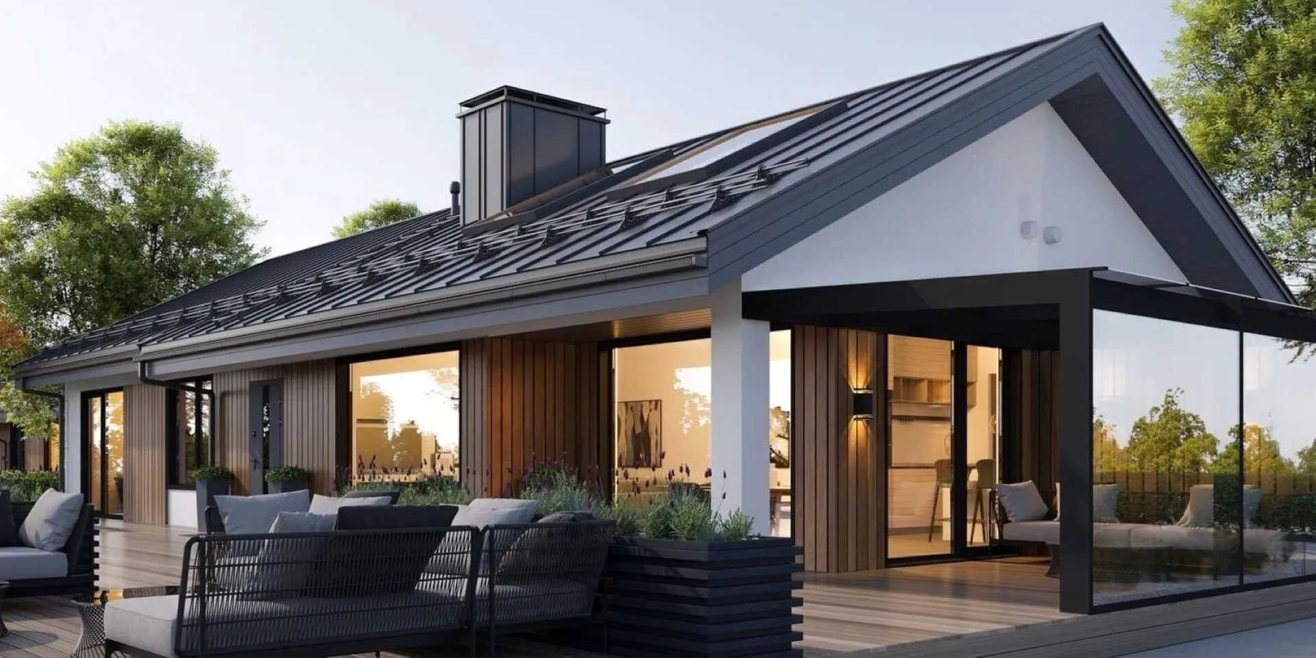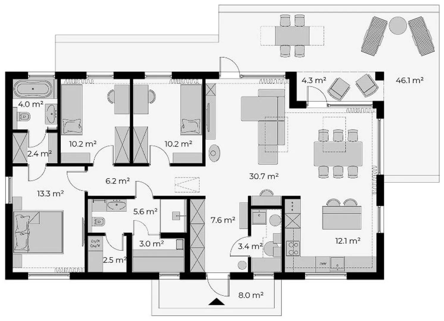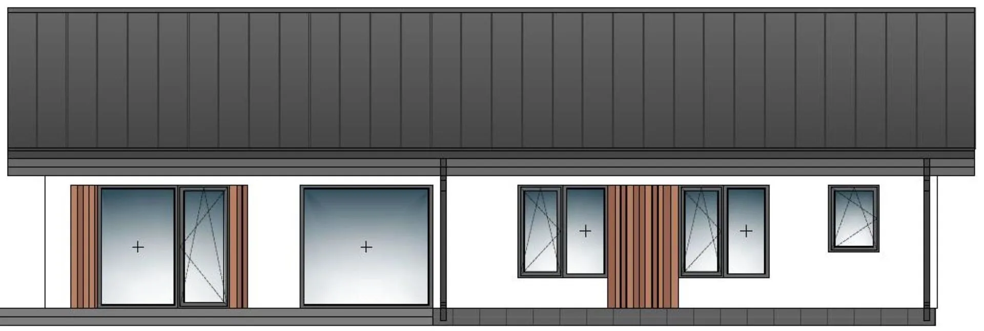 Добро пожаловать в **МИКЕЯ 5** – одноэтажный дом, где европейский стиль и уют встречаются воедино. Просторная веранда приглашает проводить вечера, наслаждаясь свежим воздухом, а терраса, раскинувшаяся над живописным участком, становится идеальным местом для завтрака или романтического ужина под звёздами. Стены из газобетонных блоков дарят комфорт и тепло, а двускатная крыша добавляет ощущение простора и свободы. Одностояя конструкция обеспечивает круглогодичную пригодность: вы будете чувствовать себя уверенно даже в суровых погодных условиях. Чердачное помещение превращается в уютное кладовое пространство или дополнительный жилой уголок, если нужно. Это дом, где каждая деталь продумана, но при этом сохраняется простота и легкость ухода – идеальное решение для тех, кто ищет гармонию и спокойствие, но не хочет жертвовать стилем.