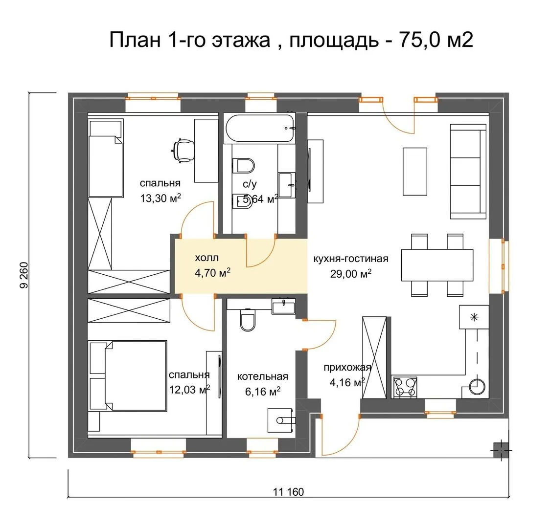 Заказать конусльтацию по:МК-01-2024 одноэтажный дом площадь 75 кв.м.