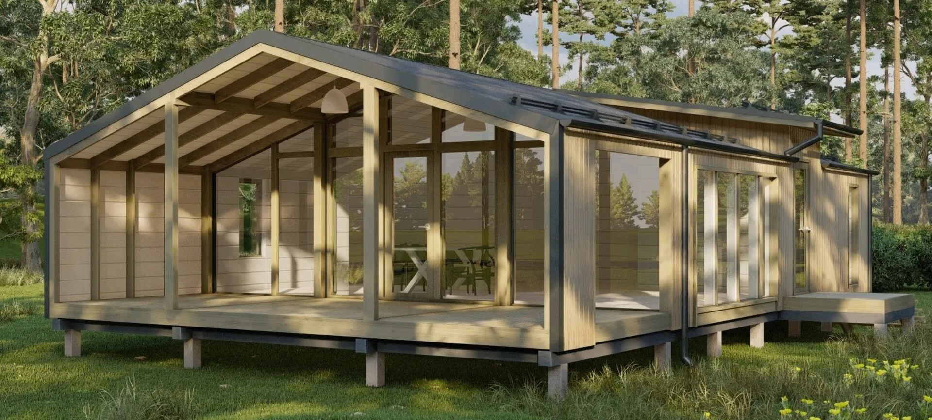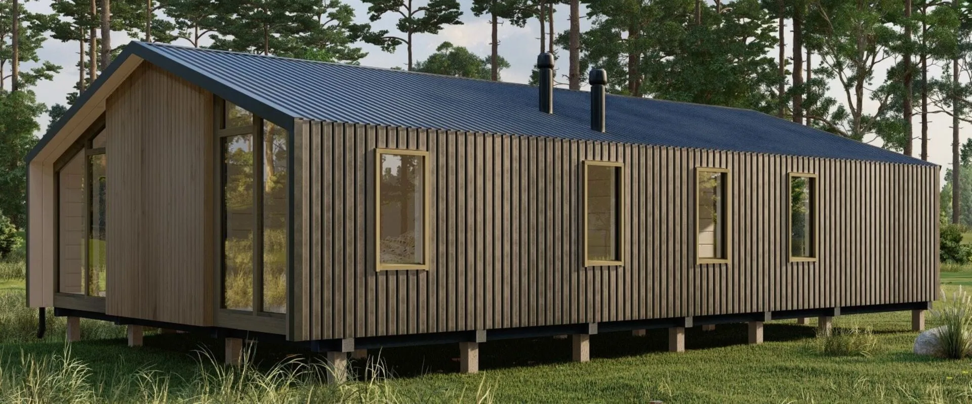 Представьте себе уютный, одноэтажный дом в стиле **Barnhouse**, который станет вашим персональным уголком в любой сезон. Модульный дом FL 65 (ПО65) построен на прочной деревянной рамке, позволяющей сохранить тепло в холодные зимние месяцы и прохладу в летние дни. Его простая, но элегантная архитектура в сочетании с двумя крылами и открытой площадкой создает ощущение лёгкости и свободы, будто вы живёте в доме, где каждое утро начинается с теплого света. В этом доме предусмотрено всё необходимое для комфортной круглогодичной жизни: просторная гостинная с открытым планом, светлые спальни и современный кухонный остров, где легко приготовить обед или ужин с семьёй. Выйдя на уютную террасу, вы обретете мгновенный доступ к свежему воздуху и бескрайним просторам наружного пространства — это идеальное место для вечерних чаев или завтраков на солнце. Благодаря минимальному количеству конструкций и открытости фасада, каждый уголок вашего нового дома ощущается живым, натуральным и гармоничным. Если вы ищете современное жильё, которое сочетает в себе практичность, эстетическую привлекательность и энергоэффективность, FL 65 — это ваш ключ к уюту и спокойствию. Это не просто дом; это образ жизни, где простота встречается со стилем, а каждый день начинается с приятных ощущений домашнего тепла.