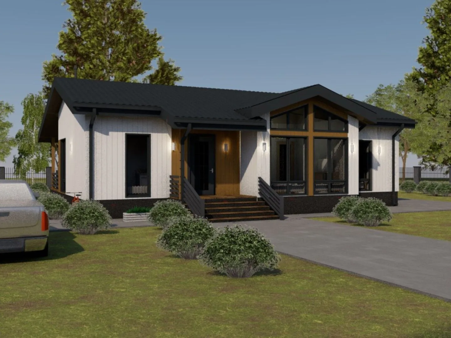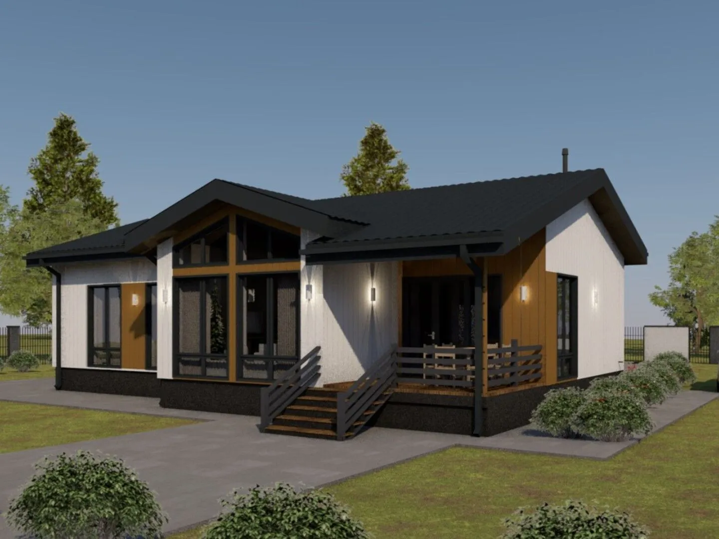 **Одноэтажная дача «КОМФОРТ» — Ваш оазис уединения и уюта.** 115 м² гармонично распределено между уютной гостиной, светлым столовой, современной кухней, тёплой спальней и дополнительным рабочим пространством — всё, что нужно для круглогодичного проживания. Приходите на утреннюю прогулку, а в вечерние часы уютно устроитесь в просторном спа‑углу в вольной форме. Внутри дома преобладает ровный свет и тепло деревянных стен, выполненных в скандинавском стиле, и создаёт идеальную атмосферу спокойствия и простора. **Фасад в элегантном деревянном каркасном стиле** гармонично вписывается в любой ландшафт, а двускатная крыша придаёт ему классический скандинавский вид. На открытой террасе можно сажать растения всех сезонов, а поздние осенние дожди будут отражаться в блеске водяных капель, создавая впечатление жизни в живой парилке. Отсутствие балконов и веранды позволяет сфокусироваться на открытом пространстве: здесь каждый вечер можно наслаждаться звуками природы, не покидая уютной жилой зоны. «КОМФОРТ» — это не просто дом, это ваша личная стихия, где каждая деталь служит вам, а стиль и уют создают атмосферу, которую хочется влюбиться. Приглашаем вас открыть для себя идеальное сочетание простоты, комфорта и природы.