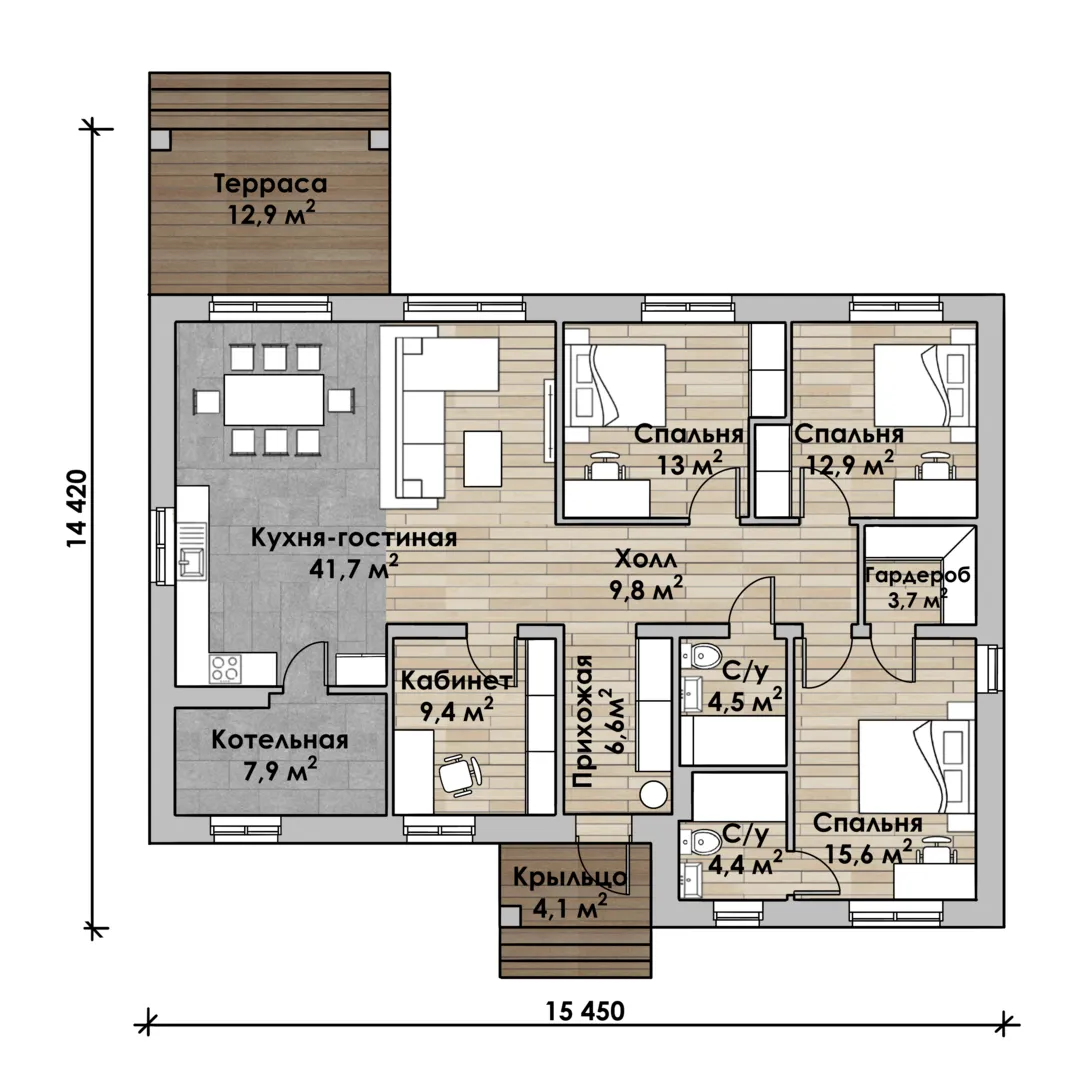 Заказать конусльтацию по:Одноэтажный дом c террасой LV-146