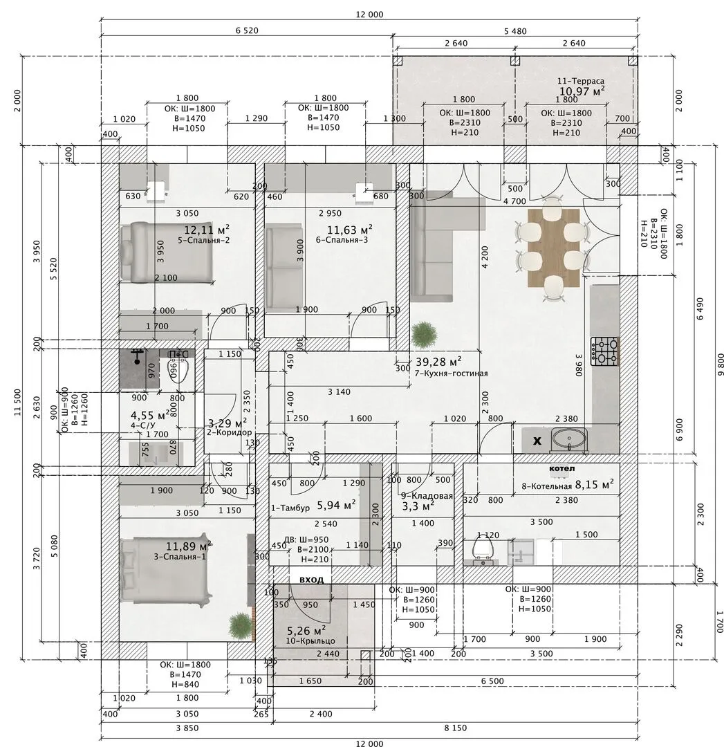 Одноэтажный дом из арболита с террасой