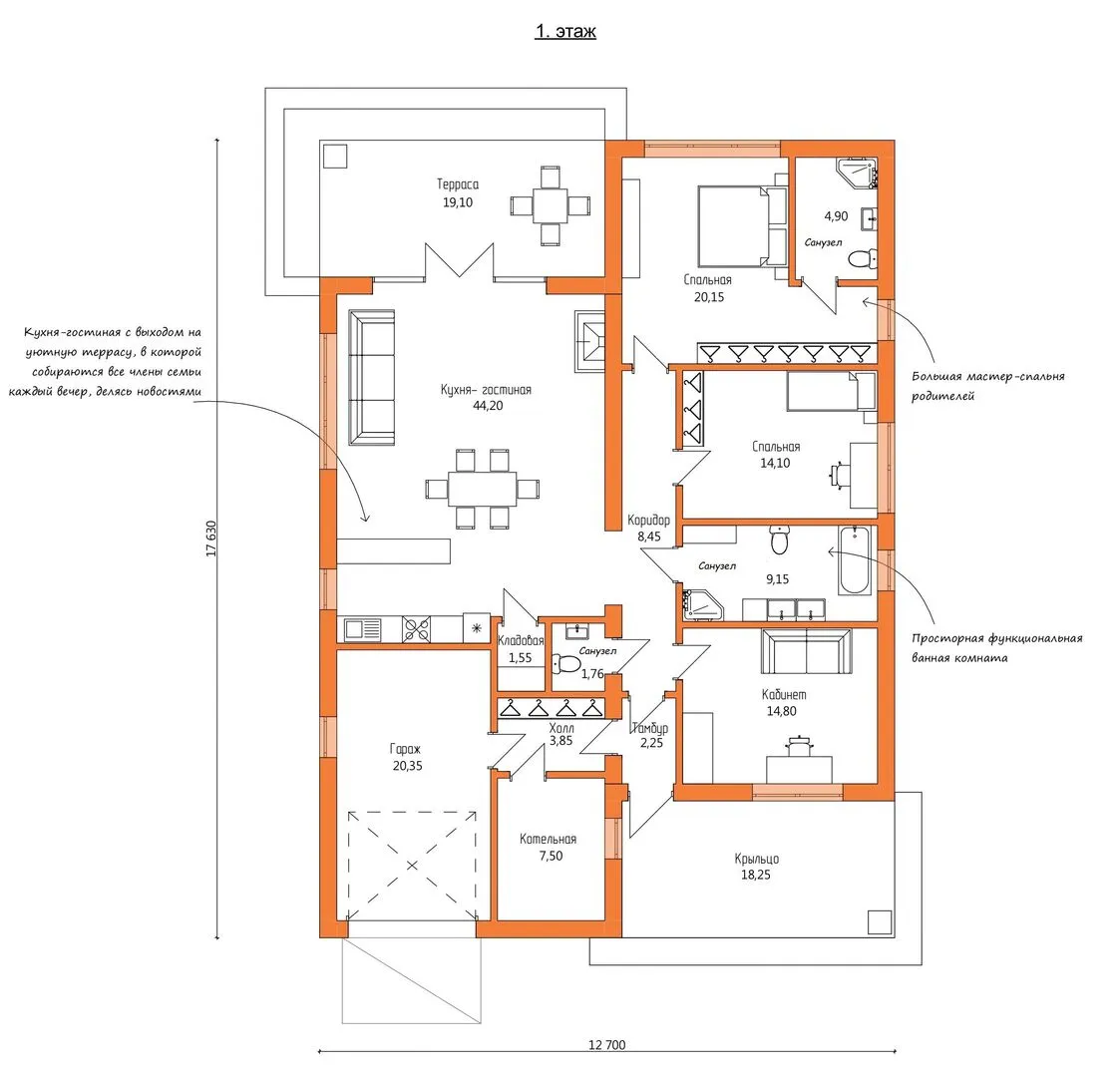 Пасха – это нежный одноэтажный шедевр в европейском стиле, где каждая деталь отзывается красотой и уютом. Внутри ощущается тепло и свет, а открытая планировка позволяет вам полностью погрузиться в атмосферу комфорта. Квадрократная вальмовая крыша не только гарантирует надежную защиту от непогоды, но и добавляет зданию характерный очаровательный силуэт, который будет привлекать взгляды соседей и прохожих. Собственники могут наслаждаться круглогодичным проживанием благодаря продуманной теплоизоляции и использованию газобетонных блоков, обеспечивающих энергоэффективность и стабильную внутреннюю температуру. Пристроенный гараж/крытая автостоянка обеспечивает удобство и безопасность вашего автомобиля, а просторная терраса станет идеальным уголком для летних вечеров, уютных завтраков и семейных посиделок на свежем воздухе. Незаменимая свобода и простота, которые создаёт одноповерхность, позволяют легко планировать внутренние пространства под любые стилистические предпочтения. Дом «Пасха» – это не просто жильё, это приглашение жить в гармонии с природой и современными комфортными стандартами. Он сочетает в себе элегантный европейский дизайн с функциональными особенностями: нет балконов и веранд, но зато есть просторная терраса, которая открывает двери к прекрасному открытию пространства за пределами дома. Этот уникальный дом откроет для вас новую главу уюта и благополучия, где каждый день начинается и заканчивается в атмосфере истинного уюта и благородного стиля.