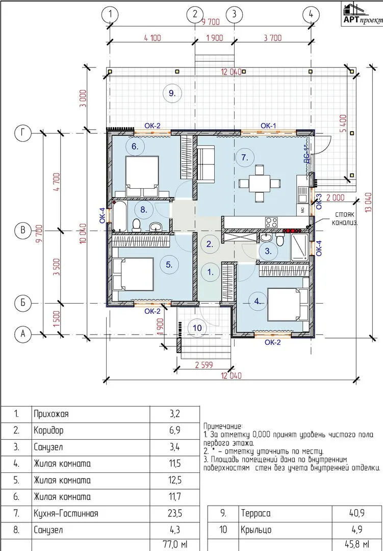 Заказать конусльтацию по:Одноэтажный дом площадью 77 кв.м.