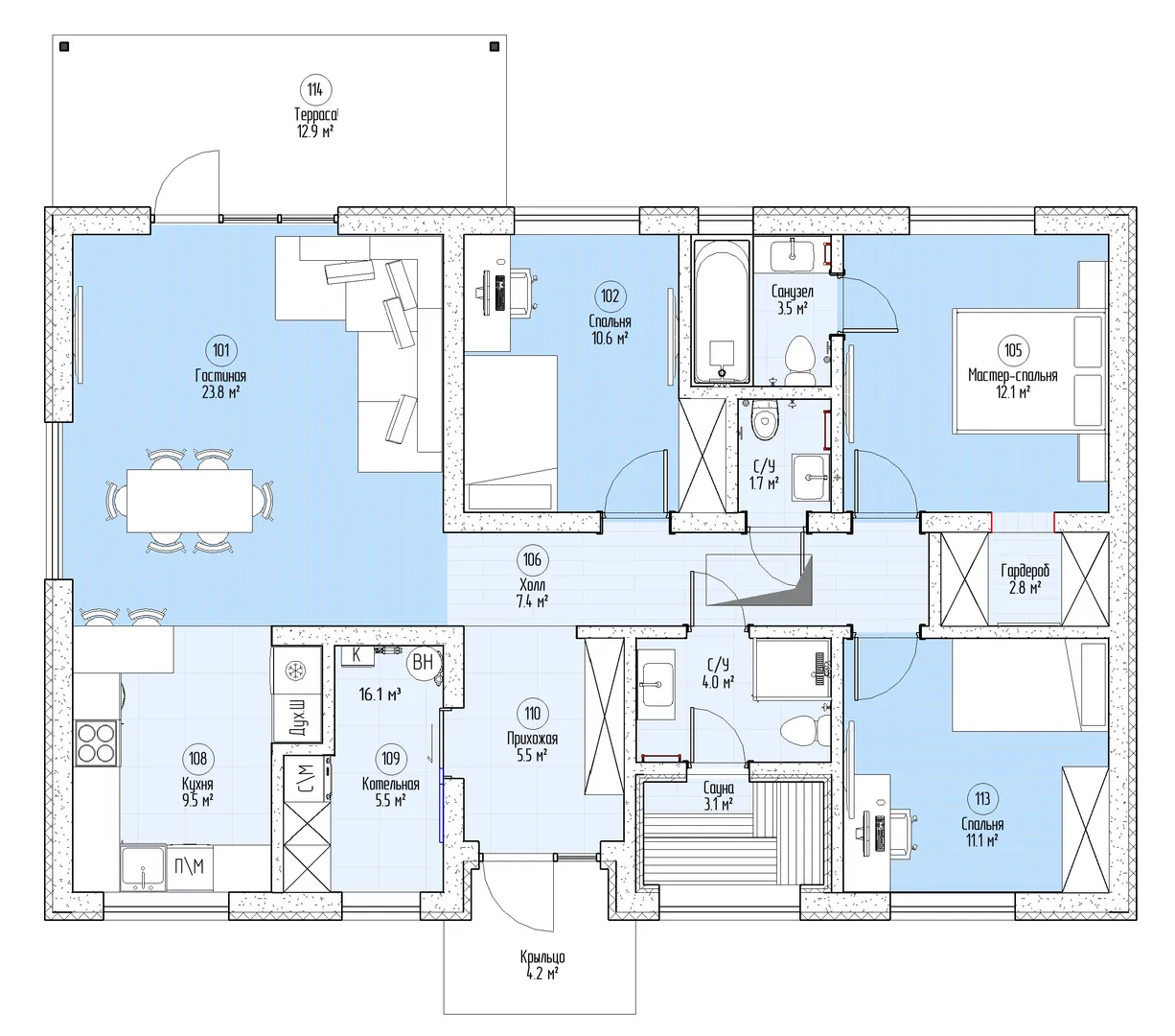 Одноэтажный дом по проекту Латен Макс — 114 м2
