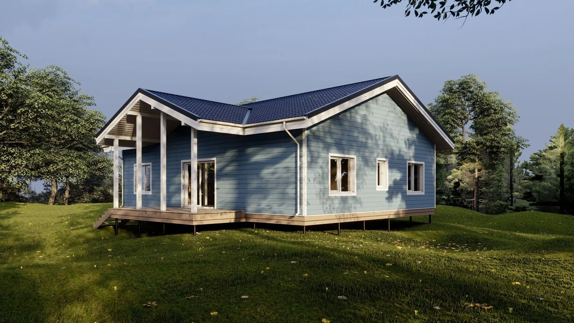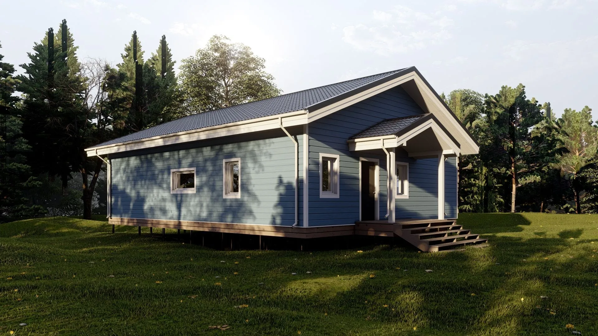 Нежный северный стиль встречается с функциональностью в этом одном­этажном доме площадью 128,7 м². Его простая, но изящная планировка воплощает скандинавские ценности – открытость, свет и связь с природой. Из прозрачных стеклянных фасонов вы открываете целую панораму над местностью, а деревянные каркасные стены создают тепло, которым можно наслаждаться круглый год. Удобное одноэтажное решение избавляет от лишних лестниц и обеспечивает простую адаптацию любых помещений под индивидуальные потребности: от уютной гостиной до полностью оборудованной кухни с островом. Пастельный свет, который проникает в каждый уголок, делает пространство максимально ярким и живым. А уютная терраса, открытая скольки угодно, позволяет весной и осенью проводить время на свежем воздухе, а зимой насладиться тихим уютом под уютным навесом. Накопительный чердачний отсек, полностью пригодный как к хранению, так и к превращению в спальню, дополнительную мастерскую или домашний кинотеатр. Двускатная крыша, которую легко обслуживать, придает дому характерный силуэт, который гармониует с окружением. Все это – идеальное сочетание минимализма, комфорта и практичности, чтобы каждый нашёл здесь свое личное уединение и вдохновение.