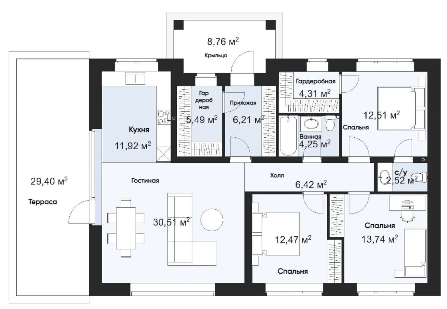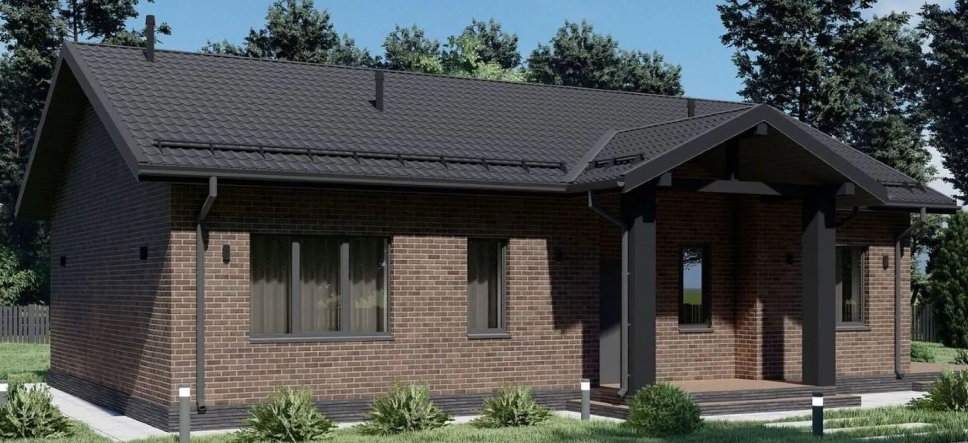 Одноэтажный дом с террасой, тремя спальнями и отделкой штукатуркой
