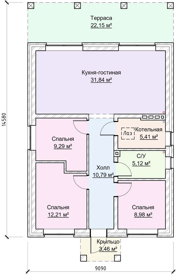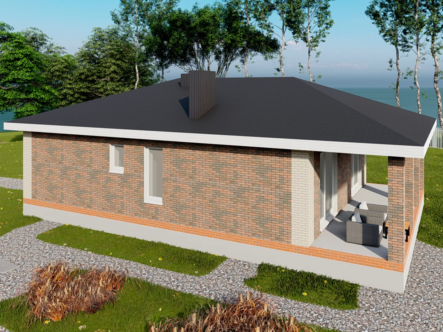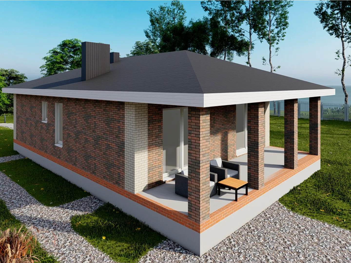 Одноэтажный дом с крыльцом и террасой