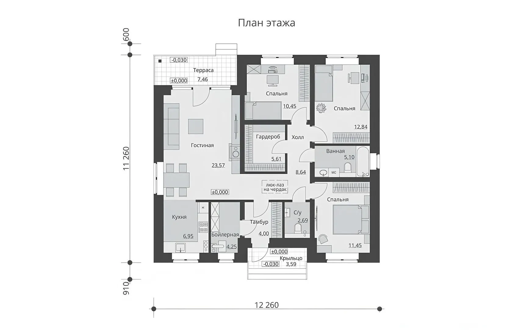 Заказать конусльтацию по:Одноэтажный дом с тремя спальнями, камином и террасой