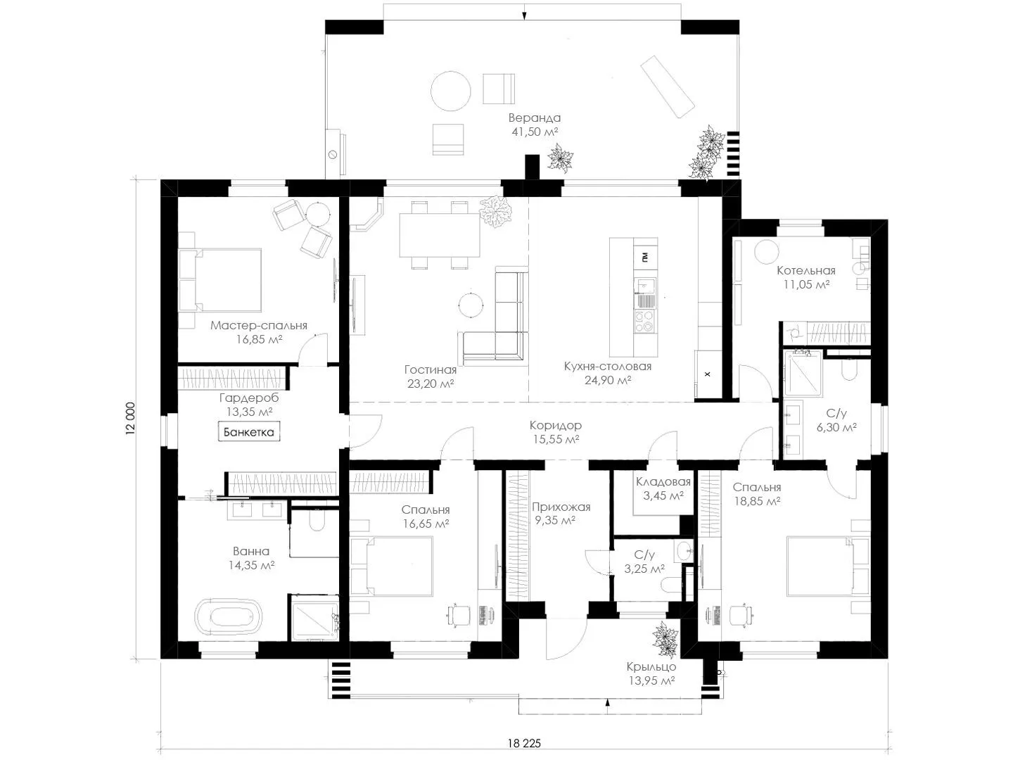 Заказать конусльтацию по:Одноэтажный дом с верандой в стиле минимализм