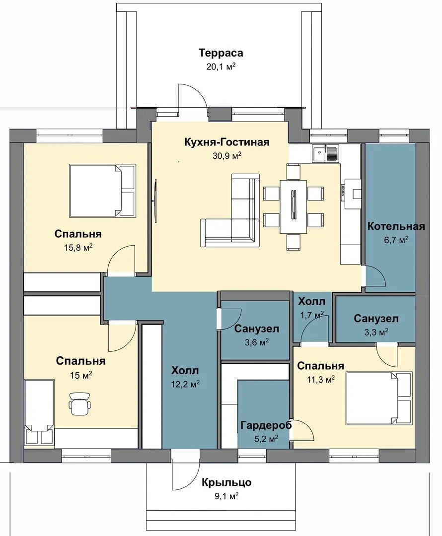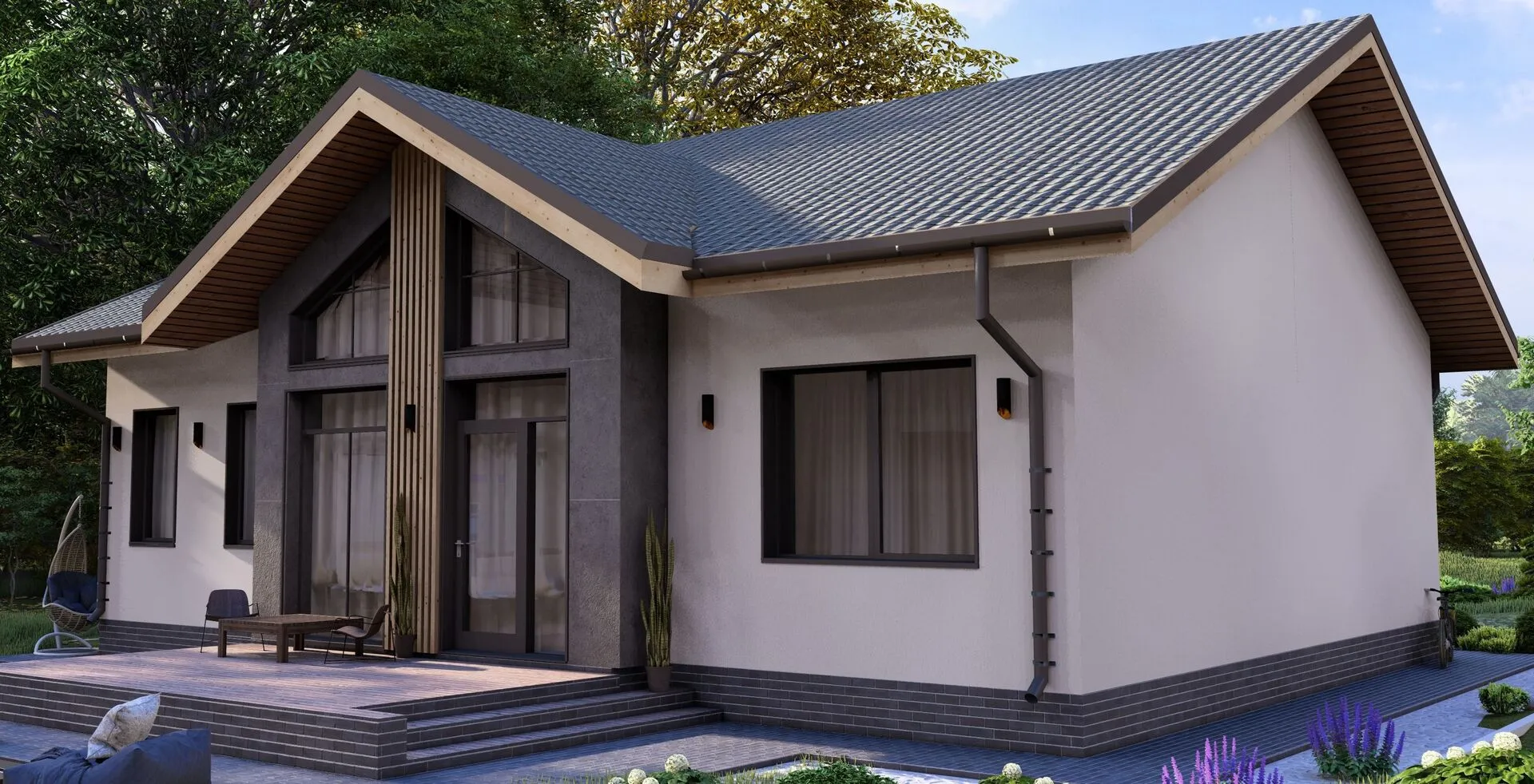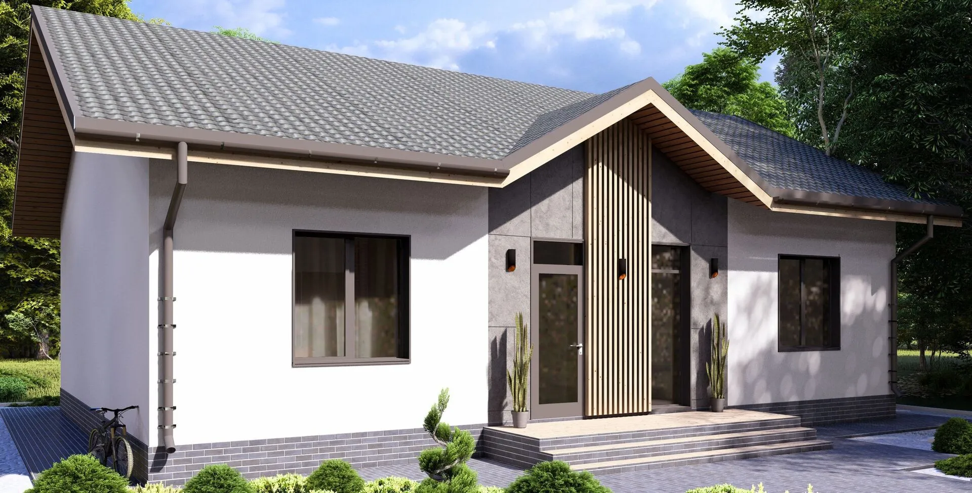 **Дорогие гости,** Пускай ваш поиск идеального дома окончательно завершится – **"Скандинавия"** – это не просто одноэтажный уголок, а целый стиль жизни, где каждая деталь создана для уюта и гармонии. Дизайн в скандинавском духе воплощает простоту и чистоту линий, а благодаря использованию газобетонных блоков стен ваш дом прослужит долгие годы, оставаясь светлым и теплыми даже в самые прохладные зимы. Просторные большие окна впускают мягкое естественное освещение, подчёркивая ощущение свободы и открытости – ведь каждый уголок этого дома открыт для ваших идей и вдохновения. **Кульминацией комфорта** является просторная терраса, где вы смело открываете двери к свежому воздуху и неповторимой атмосфере. Здесь вы можете устроить романтический ужин под звёздами, поблагодарить природу за тепло дня или просто отдыхать в компании друзей. Четырёхскатная (вальмовая) крыша не только защищает от непогоды, но и добавляет дому утончённый вид, который легко вписывается в любой природный ландшафт. Увлечён ли вы идеей жить в месте, где скандинавская простота встречается с высоким качеством строительства? Дом "Скандинавия" – ваш шанс ощутить тепло природы и комфорт современного жилья, объединённые в одном уютном объёме. Позвольте ему стать вашим новым домом и начните писать собственную историю уюта и благополучия уже сегодня.