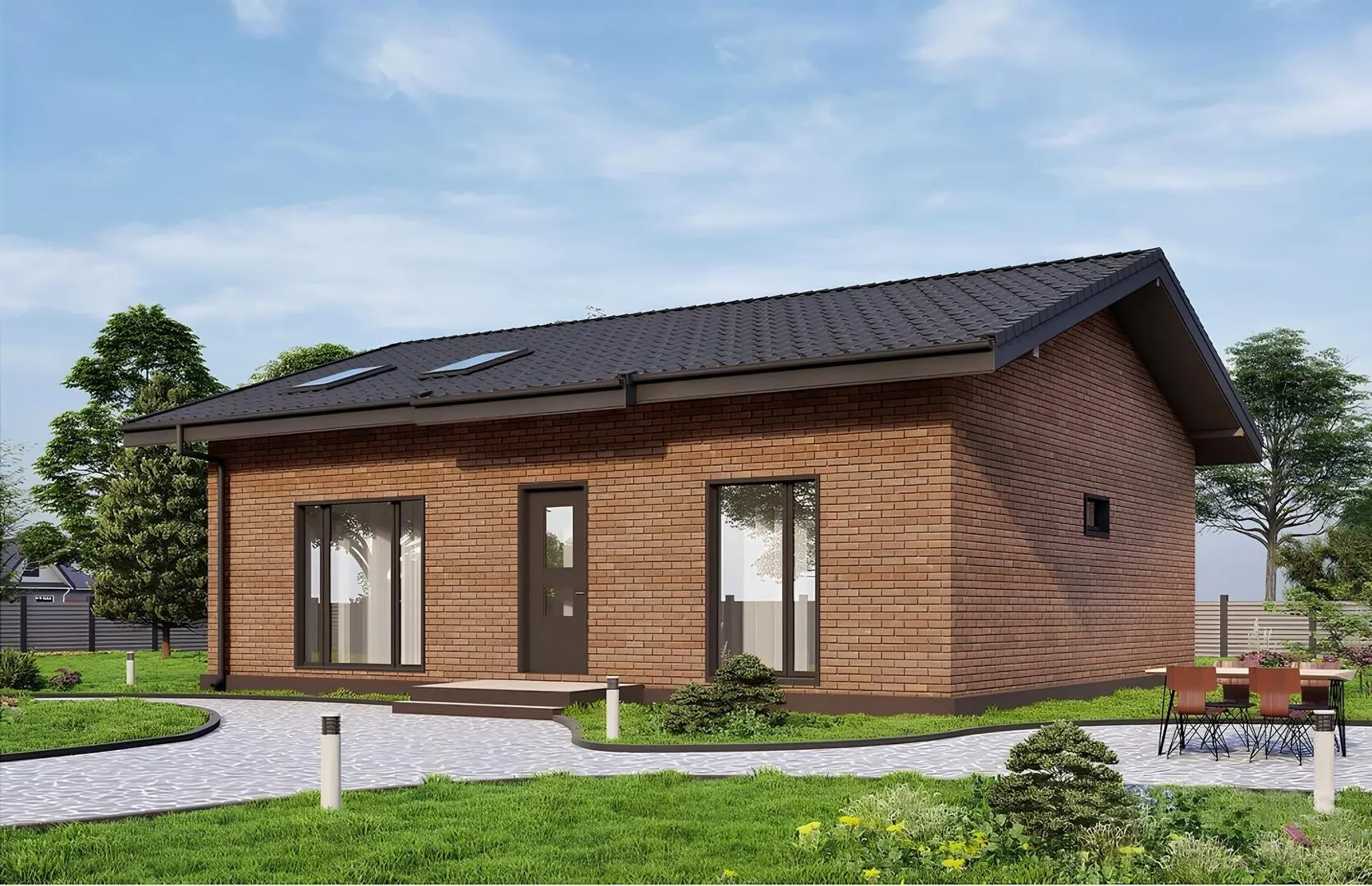 Наслаждайтесь уютом и теплом простых, классических форм в этом одноэтажном доме, где каждая деталь создана для комфортного проживания в любой сезон. Великолепный свет, проникающий сквозь просторные окна, наполняет гостиную и кухню, делая эти комнаты живыми и открытыми, а внутренний двор — идеальным местом для семейных посиделок. Звуковой комфорт сохраняется благодаря газобетонным блокам, которые обеспечивают отличную тепло- и шумоизоляцию, а двускатная крыша с плавными контурными линиями придаёт дому непревзойще свежий и элегантный вид. Дом сочетает в себе традиционный очарование с современными удобствами: просторный чердачное помещение легко преобразуется под ваш личный стиль — от дополнительного спального места до тихой домашней студии. Отсутствие балконов и веранд подчёркивает чистые линии фасада, а отсутствие прицепов и гаража освобождает пространство и делает участок более доступным для создания сада или игрового уголка. При выборе именно этого дома вы инвестируете в гармоничную среду, где каждая деталь служит вам и вашей семье.