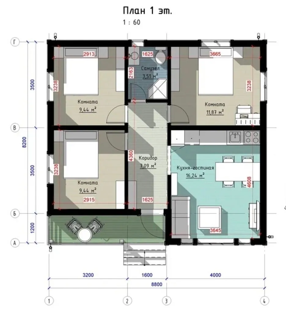 Фото 1 Одноэтажный Каркасный дом с 3 спальнями КД 83