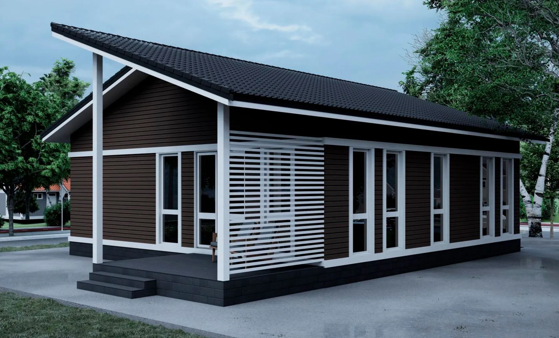 Построенный по надёжному каркасному решению TP‑110, этот одноэтажный дом сочетает в себе элегантность европейского дизайна и практичность, присущую современным семейным жилищам. Его деревянные стены создают уюта, сохраняя тепло в холодные месяцы и обеспечивая прохладу летом. Круглогодичное проживание стало реальностью благодаря продуманной теплоизоляции и грамотной организации пространства: каждый уголок наполнен светом, а пространство внутри адаптировано под разные жизненные ритмы – от тихого семейного отдыха до активного досуга. Постройка выглядит истинным произведением архитектурного искусства: двускатная крыша подчёркивает простоту линий и придаёт дому благородный облик, а отсутствие лишних балконов и веранд позволяет сфокусироваться на внутренней гармонии. Ключевая особенность – большая просторная терраса, где вы сможете насладиться чашечкой утреннего кофе, вечерним закатом или просто отдохнуть в тени деревьев. Просторные комнаты, большие окна и внимательность к деталям делают этот дом идеальным выбором для тех, кто ценит комфорт, стиль и экологичность. Если вы ищете жильё, которое будет радовать вас каждый день, оставляя ощущение уюта и благополучия, одноэтажный каркасный дом TP‑110 – это ваш шанс воссоздать идеальный дом, где природа и современность живут рука об руку. Позвольте себе обитать в доме, созданном для того, чтобы ваша жизнь была наполнена светом, теплом и гармонией.