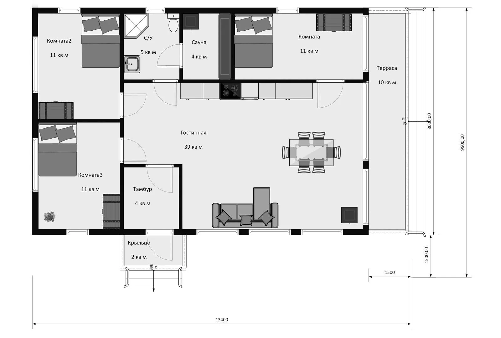 Одноэтажный каркасный дом с тремя спальнями и большой гостиной 7033