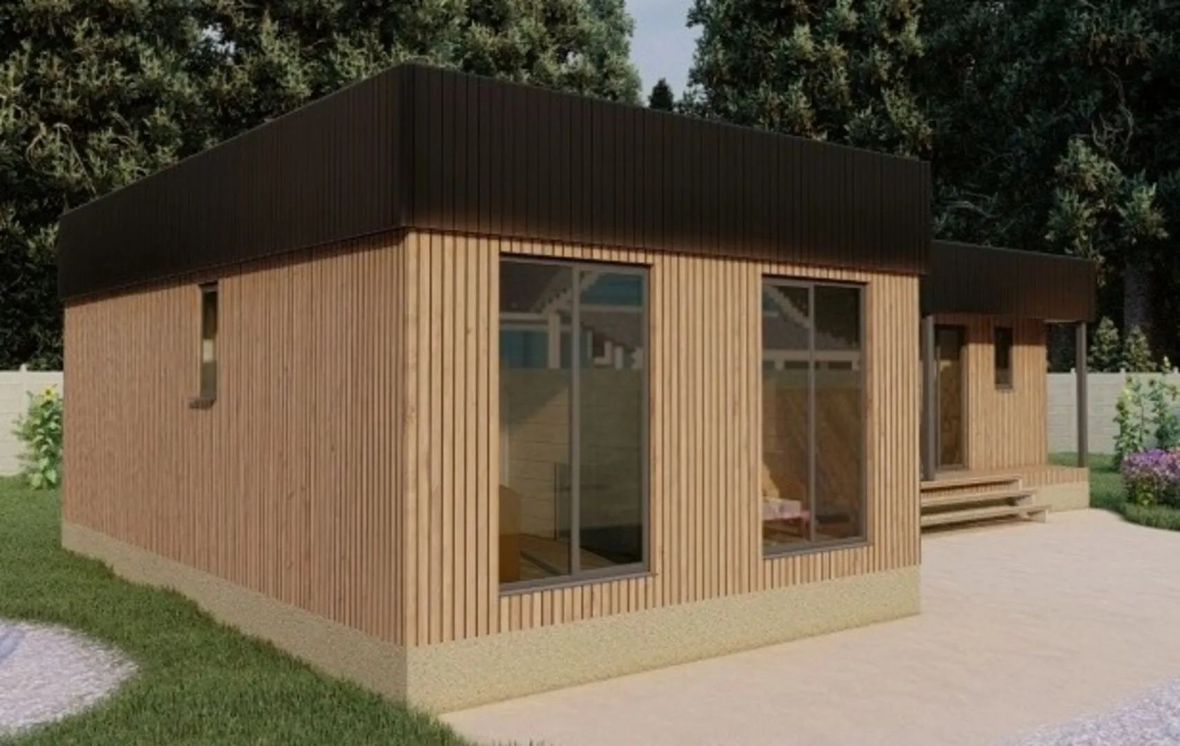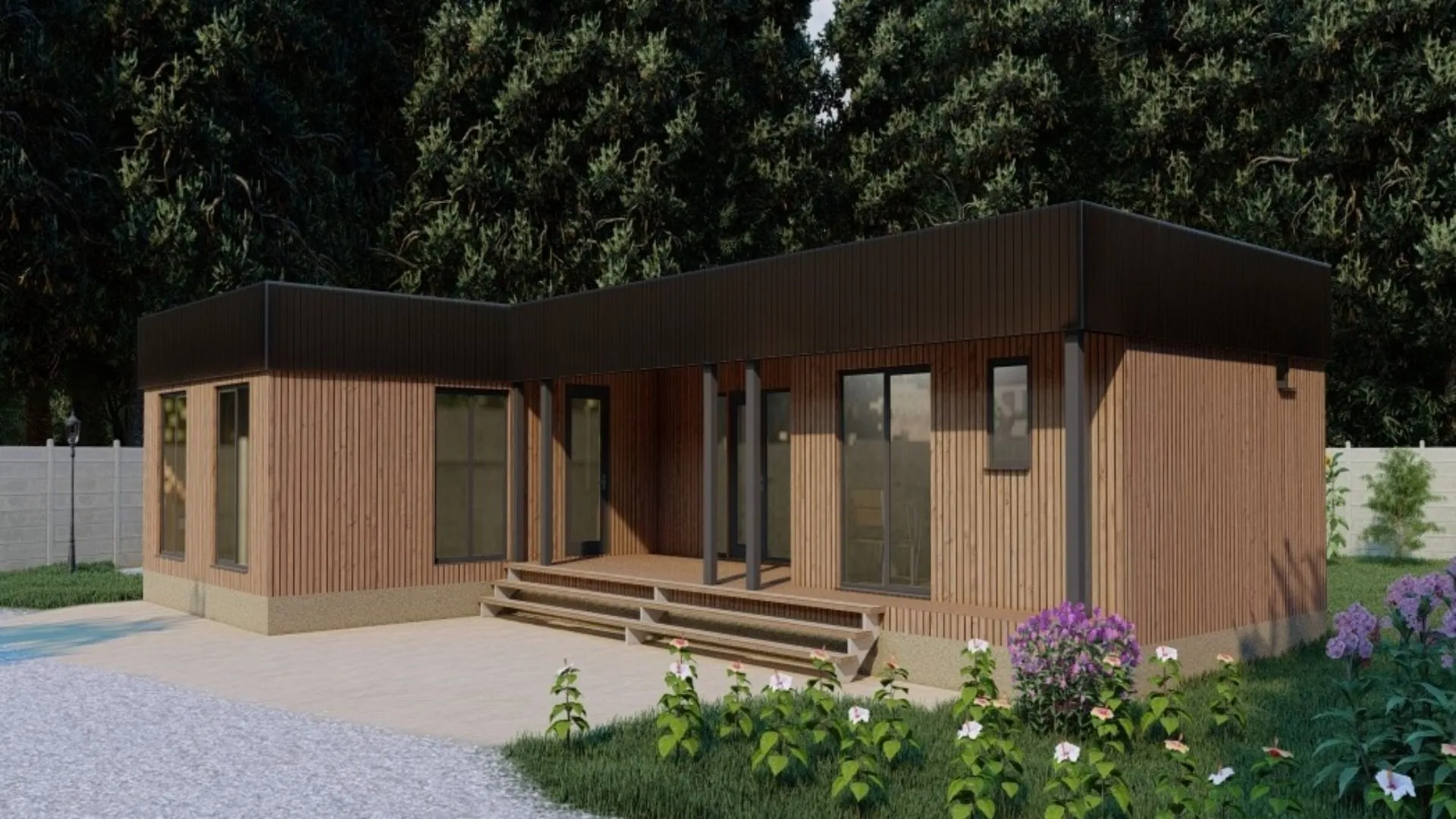 Одноэтажный модульный дом «Хайтэк» – это воплощение современного комфорта и инноваций, подходящее для круглогодичного проживания. Его открытая планировка, выполненная в высокотехнологичном стиле, создаёт ощущение простора и непринужденности. Кровля – ровная, плоская, идеально подходит для установки солнечных батарей, а деревянные каркасные стены не только сохраняют тепло, но и придают дому естественный, дружелюбный вид. Никаких лишних балконов, веранд и гаражей – всё пространство, которое вы получаете, предназначено для максимально удобного использования: открытая кухня, светлый «гостиный» зал и удобные спальни. Терраса служит как дополнительная зона отдыха и развлечений, где можно провести вечер за чашкой чая, наблюдать за звёздным небом или устроить небольшую вечернюю барбекю-вечеринку. «Хайтэк» – идеальный вариант для тех, кто ценит функциональность, современный дизайн и экономию пространства без потери уюта.