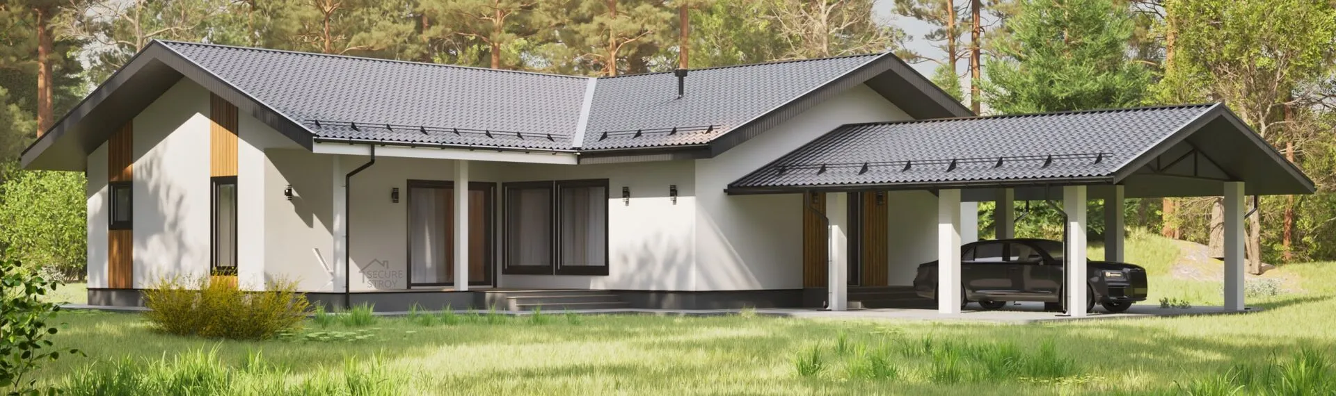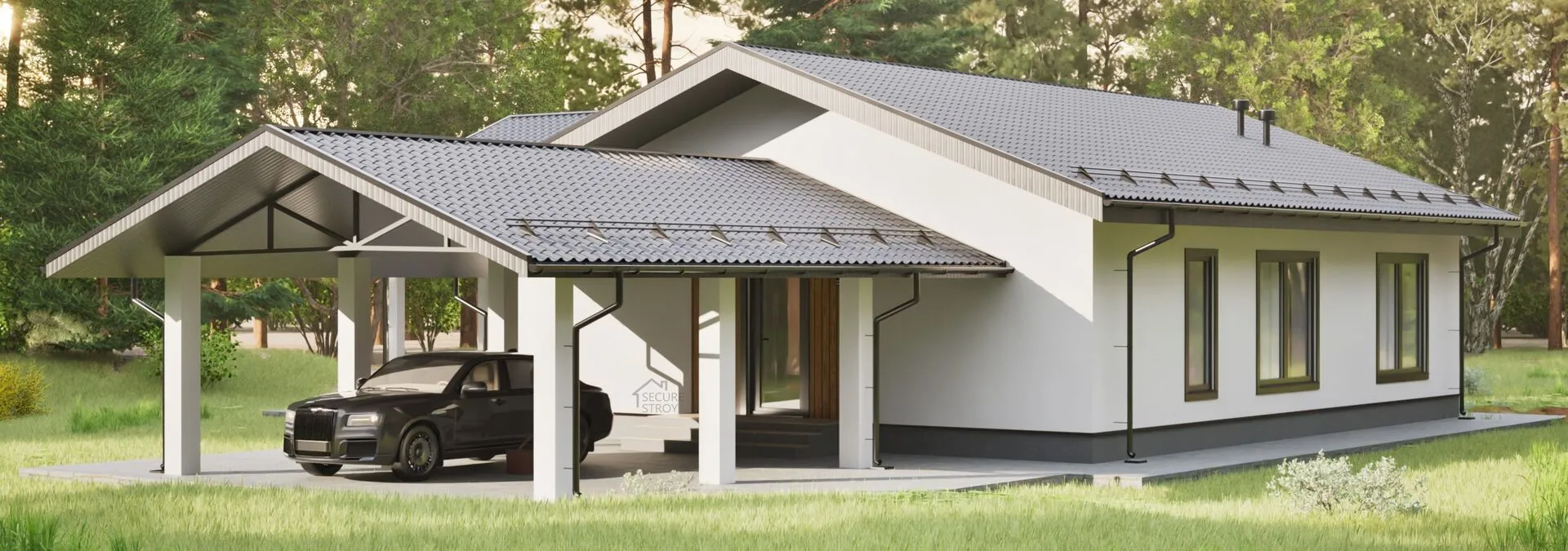 Одноэтажный современный дом с навесом для автомобиля SS-152