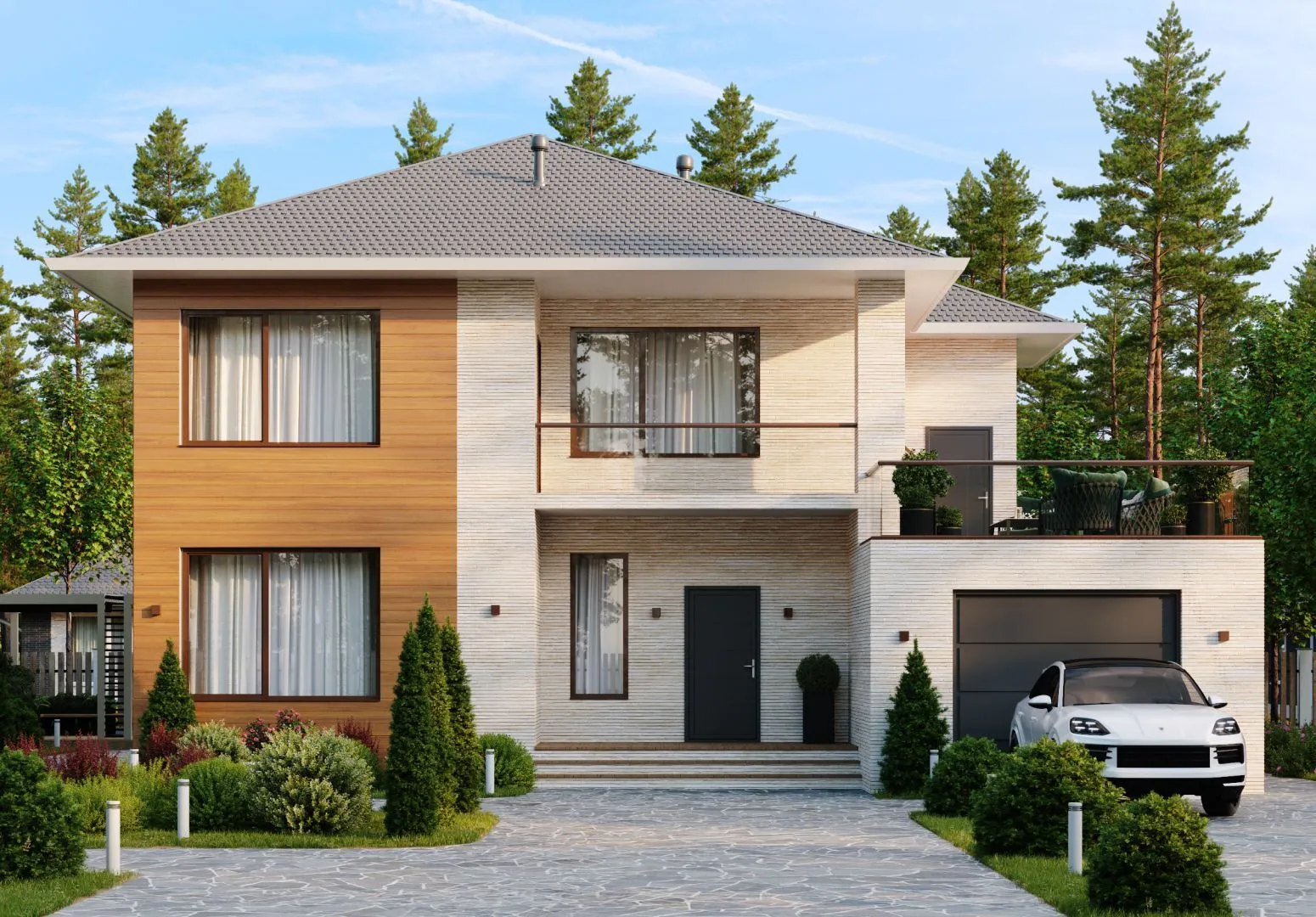 Великолепный дом проекта А004, выполненный в классическом стиле, предлагает идеальное сочетание утончённой элегантности и практичности. Его две надземные этажа просторны и светлые, так как здесь обеспечено круглогодичное проживание: большие окна и изысканные фасадные решения создают уют даже в холодные зимы, а тепло от керамзитобетонных блоков гарантирует комфорт без лишних затрат на отопление. Уникальный четырёхскатный (вальмовой) крыша придаёт дому не только привлекательный силуэт, но и защищает от сильных ветров и осадков, сохраняя энергоэффективность. Внутри вас ждёт уютная веранда-терраса, где можно наслаждаться рассветами, а также просторный балкон, открытый к живописным окрестностям. Пристроенный гараж и крытая автостоянка сохраняют ваш автомобиль в надёжной защите от непогоды, а вместительный чердачный гардероб служит дополнительным складским пространством. Этот дом — воплощение роскоши, практичности и безупречного дизайна. Он идеально подойдет для семей с детьми, которые ценят комфорт в каждом уголке, и для тех, кто ищет тихое и благополучное место, чтобы создать свою неповторимую историю. Если вы мечтаете об уютном, но элегантном доме, который будет радовать вас и вашу семью как в холодное, так и в тёплое время года – проект А004 создан именно для вас.