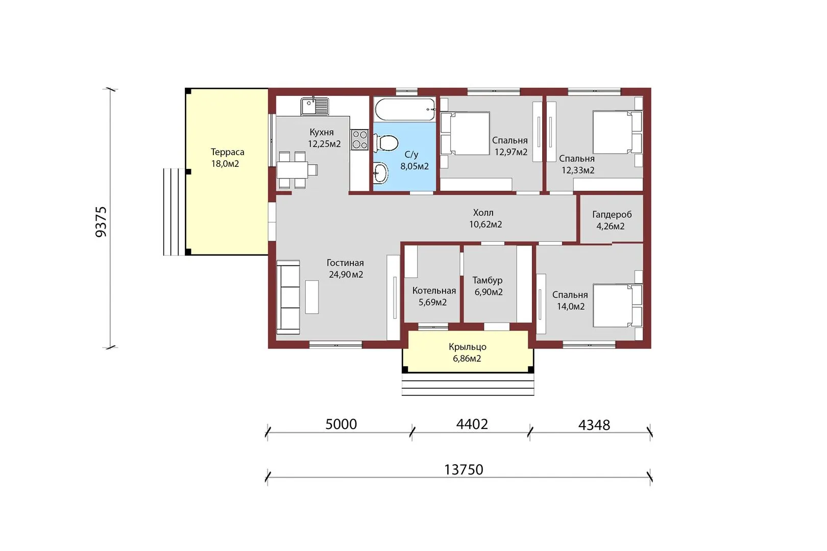 Окунитесь в атмосферу уюта и непревзойденной гармонии с нашим проектом дома №21 — воплощением классической архитектуры, созданной для того, чтобы стать вашим личным убежищем в течение всего года. Один надземный этаж объединяет функциональность и эстетику: светлые, просторные комнаты, обрамленные массивными окнами, позволяют наслаждаться природой изнутри, а простая планировка обеспечивает легкость интерьера и свободу стилистических решений. Особое внимание к материалам: внешние стены из SIP‑панелей не только гарантируют высокую энергоэффективность и долговечность, но и придают фасаду современный, «чистый» вид, подчёркнутый классическим стилем. Двускатная крыша, выполненная из качественных материалов, придаёт дому характерный силуэт и надежную защиту от погодных условий. Удобная терраса, соединяющая внутреннее пространство с открытым воздухом, станет вашим личным оазисом для прогулок, отдыха и приёма гостей. Данный проект не содержит лишних элементов, таких как балконы, лоджии, веранда, прижёсток, гаража или чердака, что делает его идеалом для тех, кто ценит чистоту линий и простоту эксплуатации. Дом №21 — это уверенность в том, что каждая деталь продумана до мелочей, а ваш дом станет местом, где хочется жить каждый день.