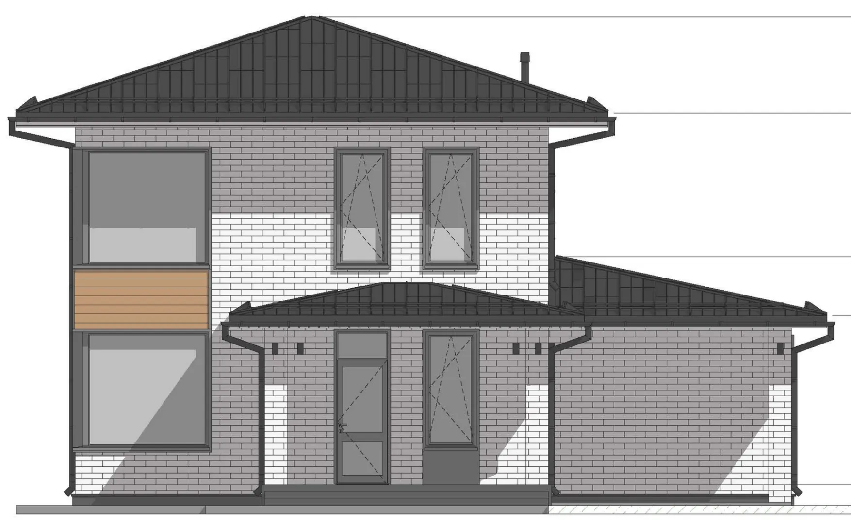 Заказать конусльтацию по:Проект эффективного двухэтажного дома с навесом для авто S-121