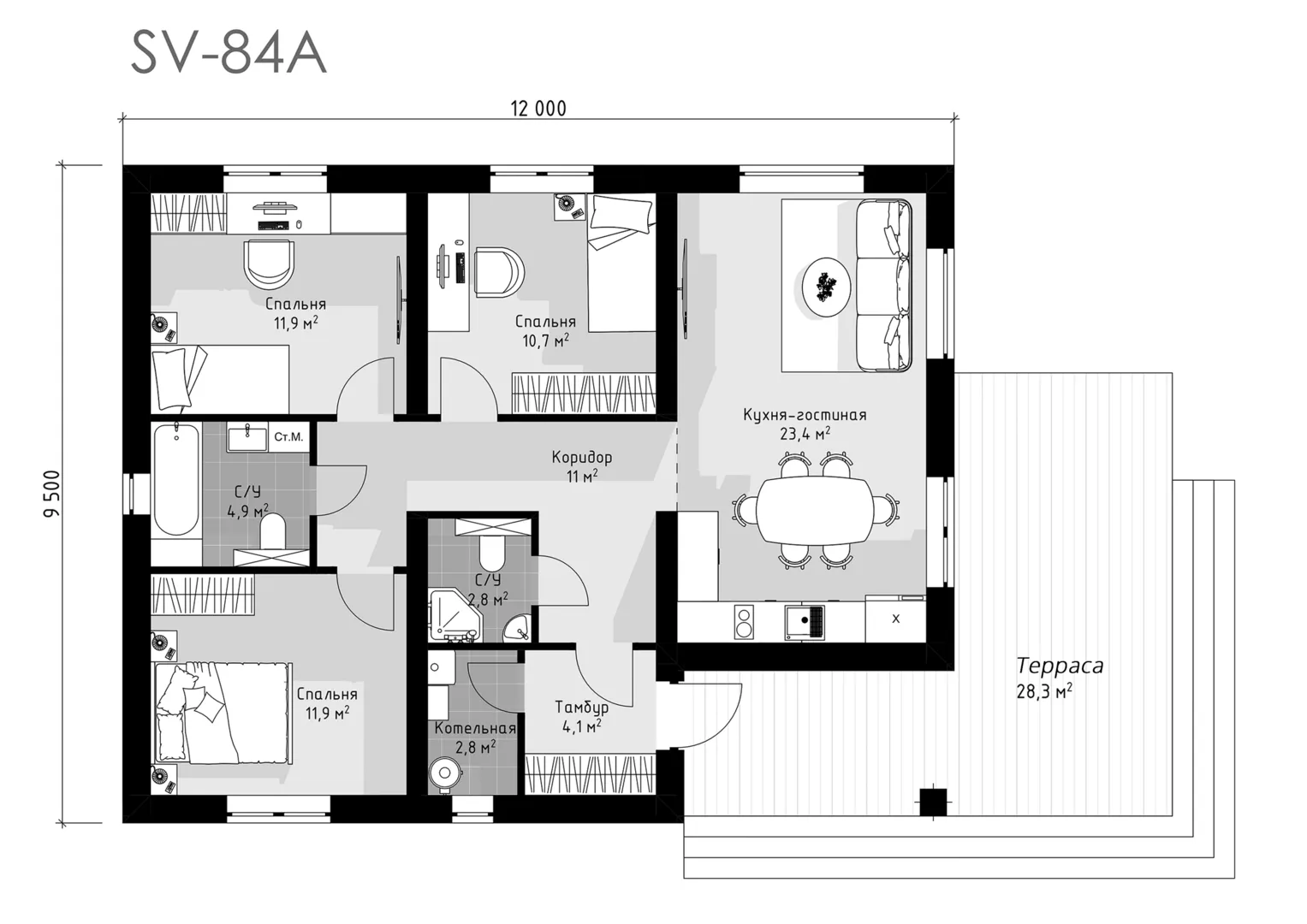 Добро пожаловать в мир простоты и уюта – дом SV‑84а, который воплощает в себе истинный дух минимализма. Величественный фасад из газобетонных блоков подчёркивает гладкую линию, а двускатная крыша добавляет нотку архитектурной динамики. Внутри – ровно один надземный этаж, но пространство здесь расходуется умно: просторные комнаты, открытая планировка и высокий потолок создают ощущение лёгкости и свободы. Терраса, возвышающаяся над уютными квартирами, приглашает к встречам с друзьями и тихим моментам за чашкой кофе, пока вы наслаждаетесь видом на город. Чердачное помещение, обустроенное как мини‑кладовая или детская, добавляет функциональности без лишних затрат. А благодаря материалам и теплоизоляции газобетона этот дом гарантирует комфорт в любое время года – от зимних морозов до летних жарких дней. Если вы цените чистые линии, практичность и возможность жить в гармонии с природой, SV‑84а станет вашим идеальным выбором.