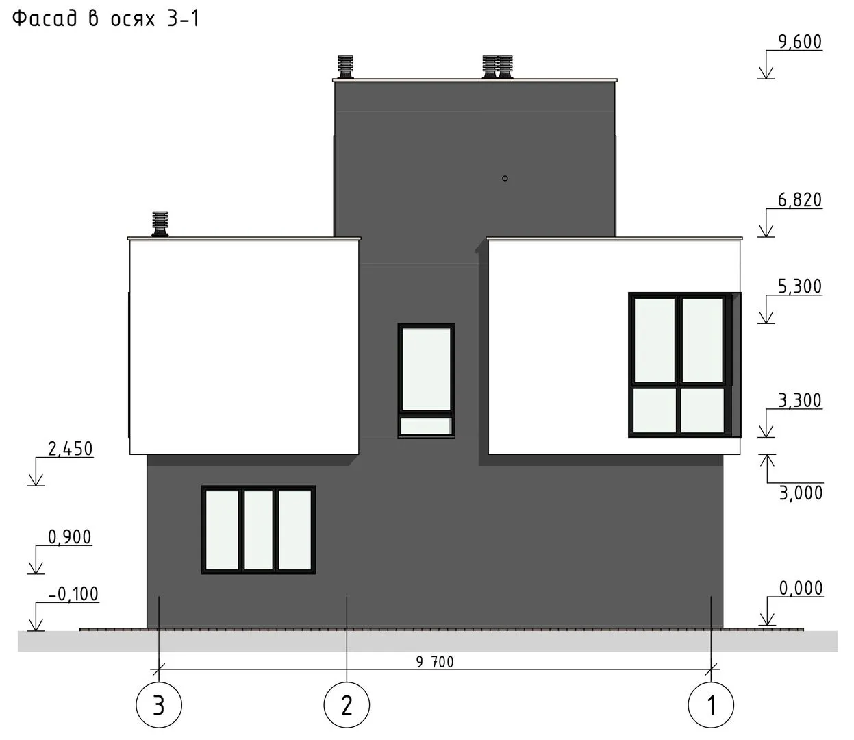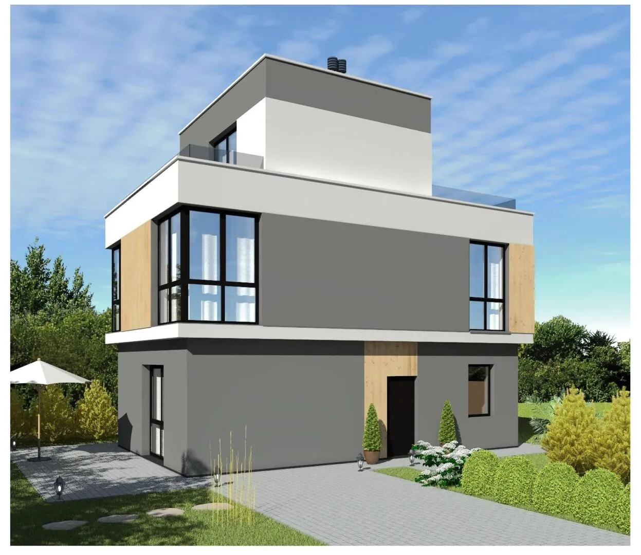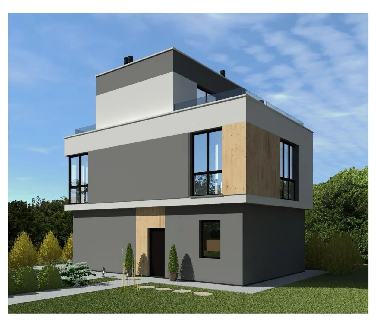 Заказать конусльтацию по:Трехэтажный дом с эксплуатируемой плоской кровлей УП