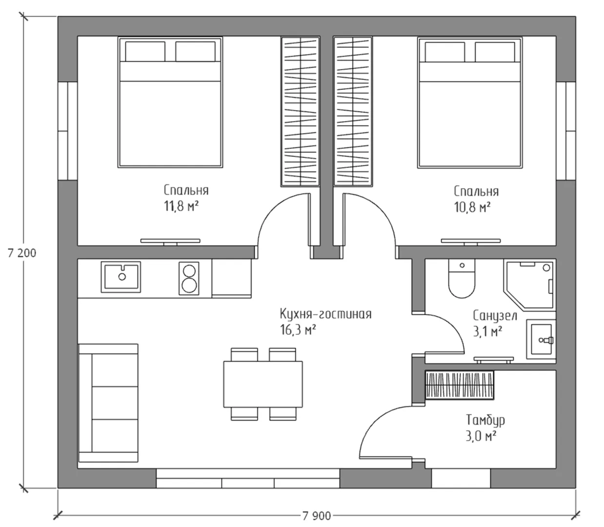 **Виктория 45 – уют в сердце города, где комфорт встречает стиль** Погрузитесь в атмосферу уюта в доме, где каждое пространство пропитано качеством и продуманной планировкой. На первом этаже расположился единственный уровень, открывающий полный контроль над внешней средой: приёмные зоны, полностью отшумленные стены и изолированные от холода окна создают ощущение тепла и уединения. Весь дом рассчитан на круглогодичное проживание, поэтому даже в зимние и влажные периоды он будет светлым и сухим, поддерживая идеальный микроклимат. **Американско‑канадская элегантность и функциональность** Виктория 45 выполнена в лаконичном американско‑канадском стиле, где строгие линии сочетаются с мягкими оттенками, придавая интерьеру тепло и гостеприимство. Внешние стены, обработанные газобетонными блоками, обеспечивают надежную звуко- и теплоизоляцию, а односкатная крыша не только подчёркивает современный дизайн, но и защищает от непогоды. Без балконов и веранд, но благодаря продуманной планировке и просторным комнатам, вы ощутите лёгкость дыхания и простоту в повседневной жизни. **Удобство и безопасность** Дом не содержит прицепного гаража или пристроенной автостоянки, но для посетителей предусмотрено удобное место для парковки рядом с входом. Отсутствие чердака и террасы позволяет сосредоточиться на функциональном жилом пространстве, а отсутствие балконов освобождает от дополнительных расходов на обслуживание. Виктория 45 – ваш новый дом, где каждый день начинается с ощущения лёгкости, уюта и уверенности, что ваш дом полностью готов к любым жизненным событиям.