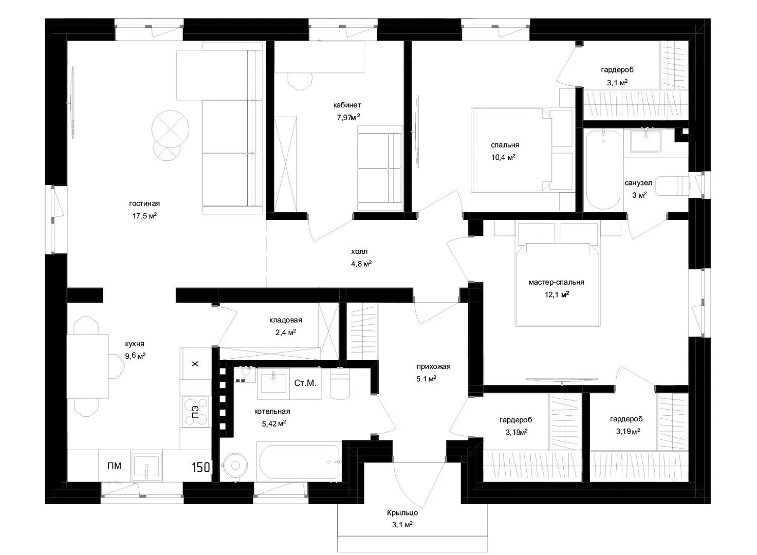 Уникальное сочетание европейской элегантности и практичности воплощено в этом загородном доме площадью 90,1 м². Благодаря одноэтажной планировке он становится идеальным убежищем для всей семьи, обеспечивая комфорт и уединение даже в самые прохладные дни. Внешние стены из высококачественного кирпича придают фасаду насыщенный, теплый характер, а классический четырёхскатный (вальмовой) крышу – символ стабильности и надёжности, словно оберегая дом от ветров и непогоды. Внутри вы найдёте просторные, светлые помещения, оформленные в строгом европейском стиле с элементами минимализма. Несмотря на отсутствие балконов, лоджий или террас, дом радует атмосферой уюта и гармонии: открытая кухня-столовая прекрасно связывает все зоны, а мягкое, естественное освещение создаёт ощущение лёгкости и простора. Круглогодичное проживание позволяет воспользоваться всеми преимуществами современного комфорта – без компромиссов по отоплению и воздухообмену. Возможности этого дома делают его отличным выбором как для молодой семьи, так и для тех, кто ценит спокойствие загородной жизни. Отсутствие пристроенного гаража открывает дополнительное пространство для сада, зоны отдыха или мини‑спальни, а кирпичная кладка гарантирует долгую службу и минимальные расходы на обслуживание. Если вам нужен уютный, надёжный и в стиле европейского шика дом, где каждый день превращается в маленькое наслаждение, этот загородный дом – именно то, что вам нужно.