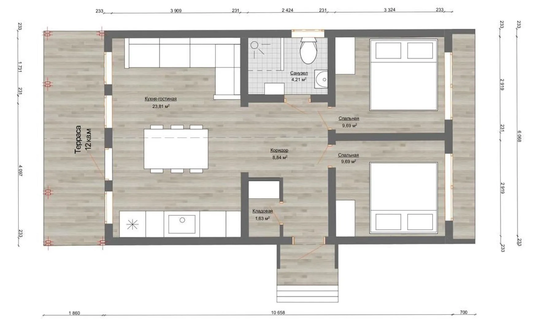 Добро пожаловать в «КРОВ» – очаровательный заброшенный дом Барн-60 в сердце природы. Строительство в стиле барнхаус придаёт ему непринужденную, но привлекательно современную эстетику: каркасно‑панельная конструкция держит тепло в холодную пору года, а классически‑шаговая двускатная крыша добавляет романтичности и устойчивости даже при сильном ветре. Одно надземное полотно, обрамлённое террасой, открывает простору живописные панорамы, позволяя наслаждаться рассветом и закатом в полном уединении. Дом создан без лишних излишков – нет балконов, веранд, автостоянок, но зато есть просторный чердачный отсек, где можно разместить мастерскую, хранилище или уютную гостиную. Просторная терраса превращается в идеальное место для барбекю, завтрака на свежем воздухе или бесед под звёздами. С «КРОВ» вы получите не только неповторимую архитектурную гармонию, но и возможность построить собственный уголок уюта, где каждый вечер звучит только ваш собственный ритм семейной жизни.