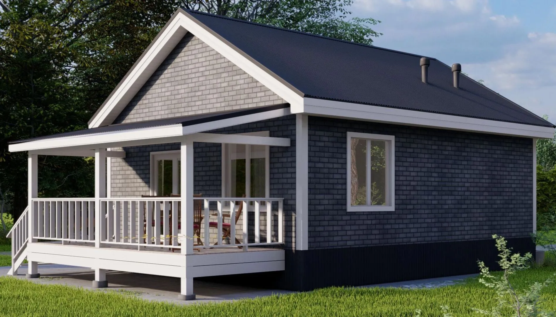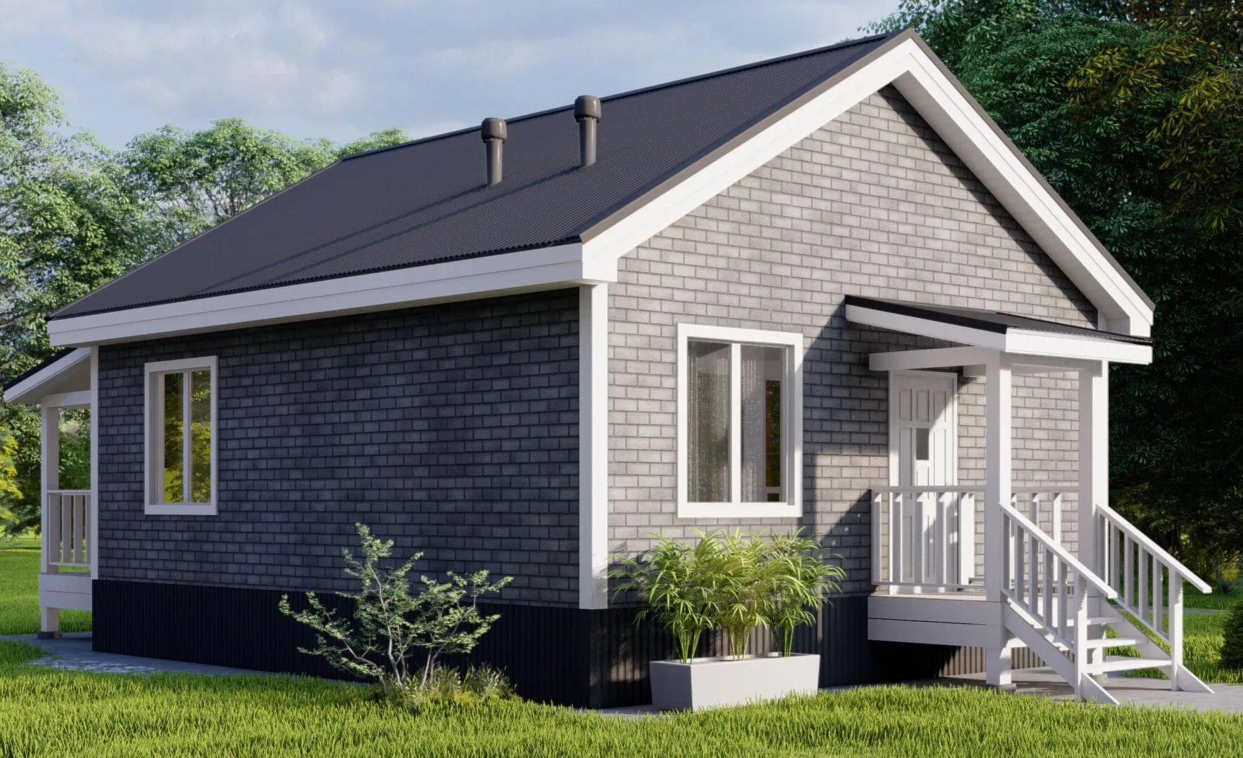 Загородный дом MINI 60 – это идеальная комбинация уюта и современного дизайна. Его простая, но элегантная архитектура в американском/канадском стиле сразу создаёт ощущение простора и тепла. В нём есть всё, что нужно для круглогодичного проживания: просторный единственный этаж, большая веранда для вечерних чаепитий и вечерних встреч с друзьями, а деревянные каркасные стены, обшитые натуральным материалом, впитали аромат леса и придают дому характерный «душевный» вид. Дом полностью рассчитан на семью: светлое, открытое пространство, где каждый уголок создаёт комфорт. Отсутствие пристройки гаража или чердака не помешает вам сэкономить, ведь в его уютных коридорах, гостиной и кухне каждый член семьи найдёт свой уголок. Двускатная крыша придаёт образу классическую «первую постройку из сказки», а просторная веранда приглашает к релаксации на свежем воздухе, наслаждаясь закатом над полями. В конце концов, MINI 60 – это ваш личный уголок, где каждая деталь продумана для того, чтобы ваши будни были легче, а отдых более насыщенным. Приходите, и вы увидите, как легко можно жить в гармонии с природой и комфортной архитектурой.